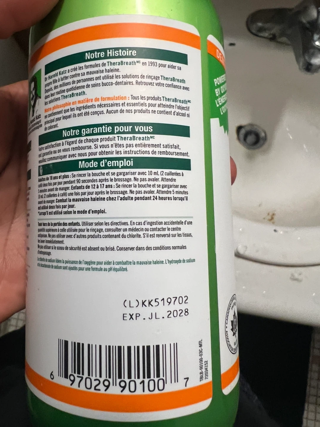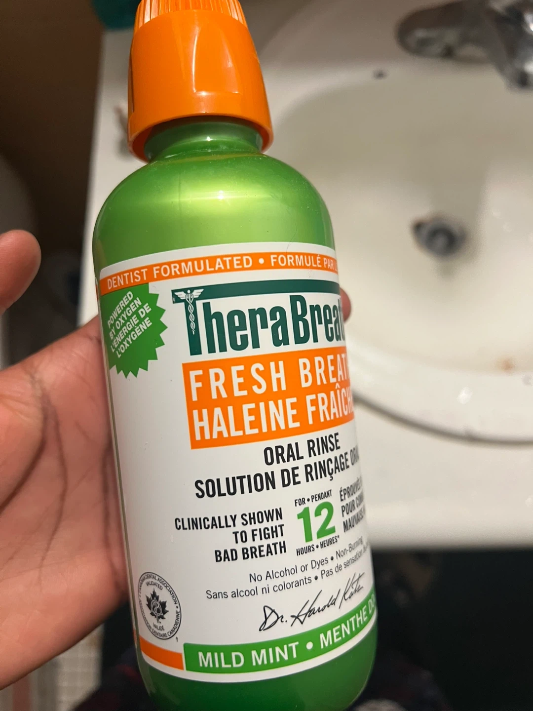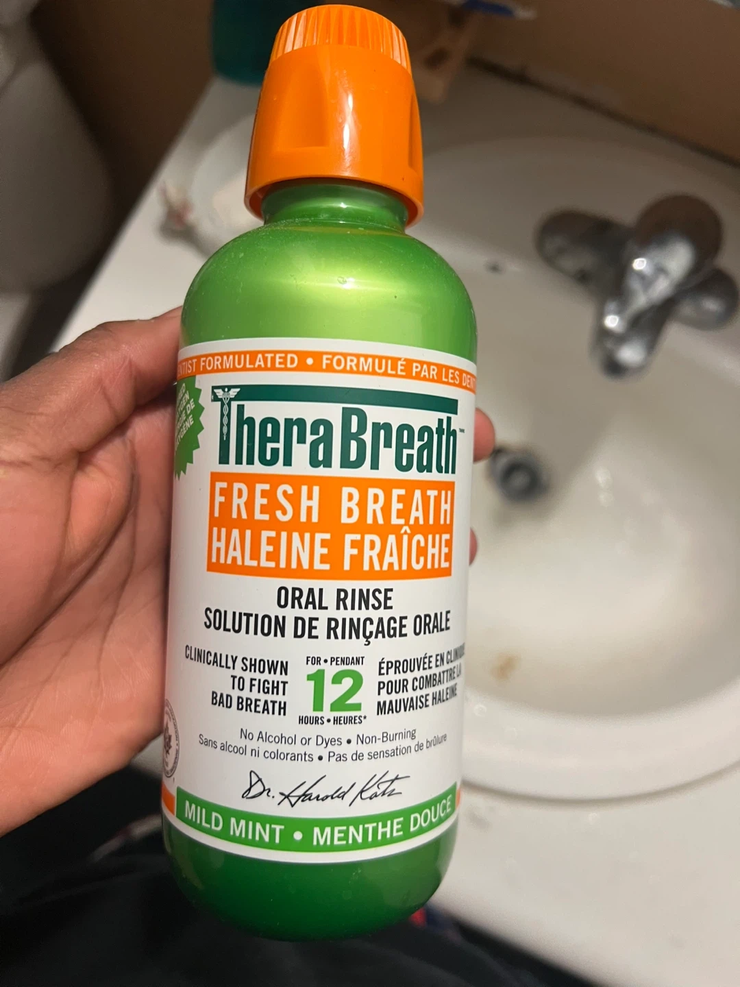 TheraBreath Fresh Breath Oral Rinse in Mild Mint flavour. Clinically shown to fight bad breath for 12 hours. No alcohol or dyes, non-burning. EXP: JL. 2028.