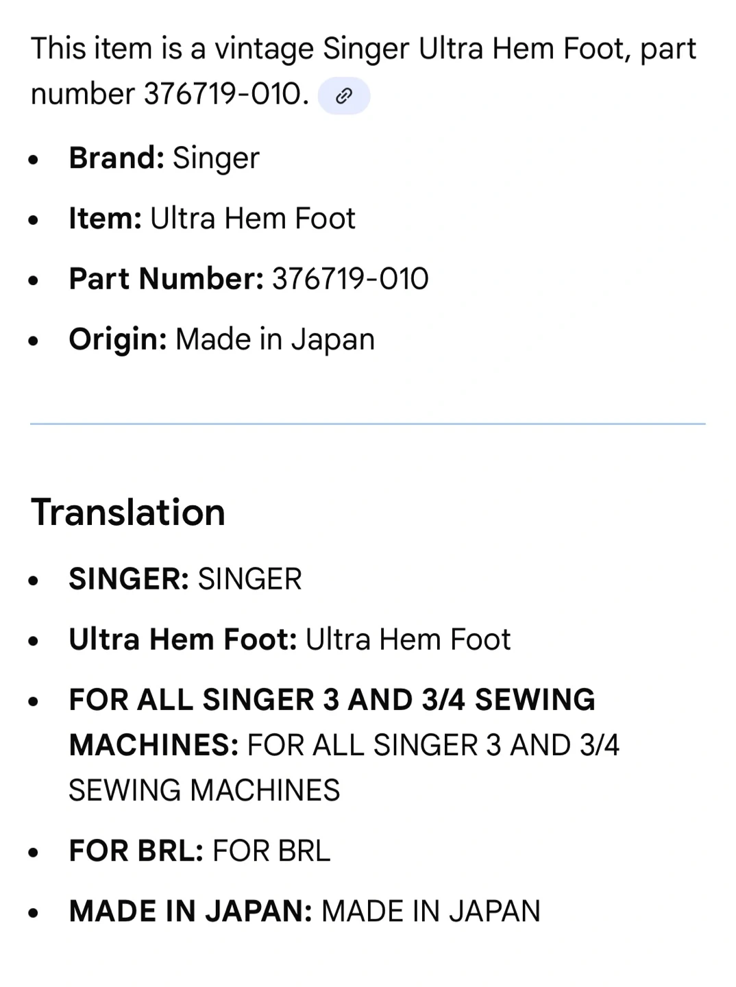 Selling a Vintage Singer Ultra Hem Foot, part number 376719-010. It's designed for all Singer 3 and 3/4 sewing machines.