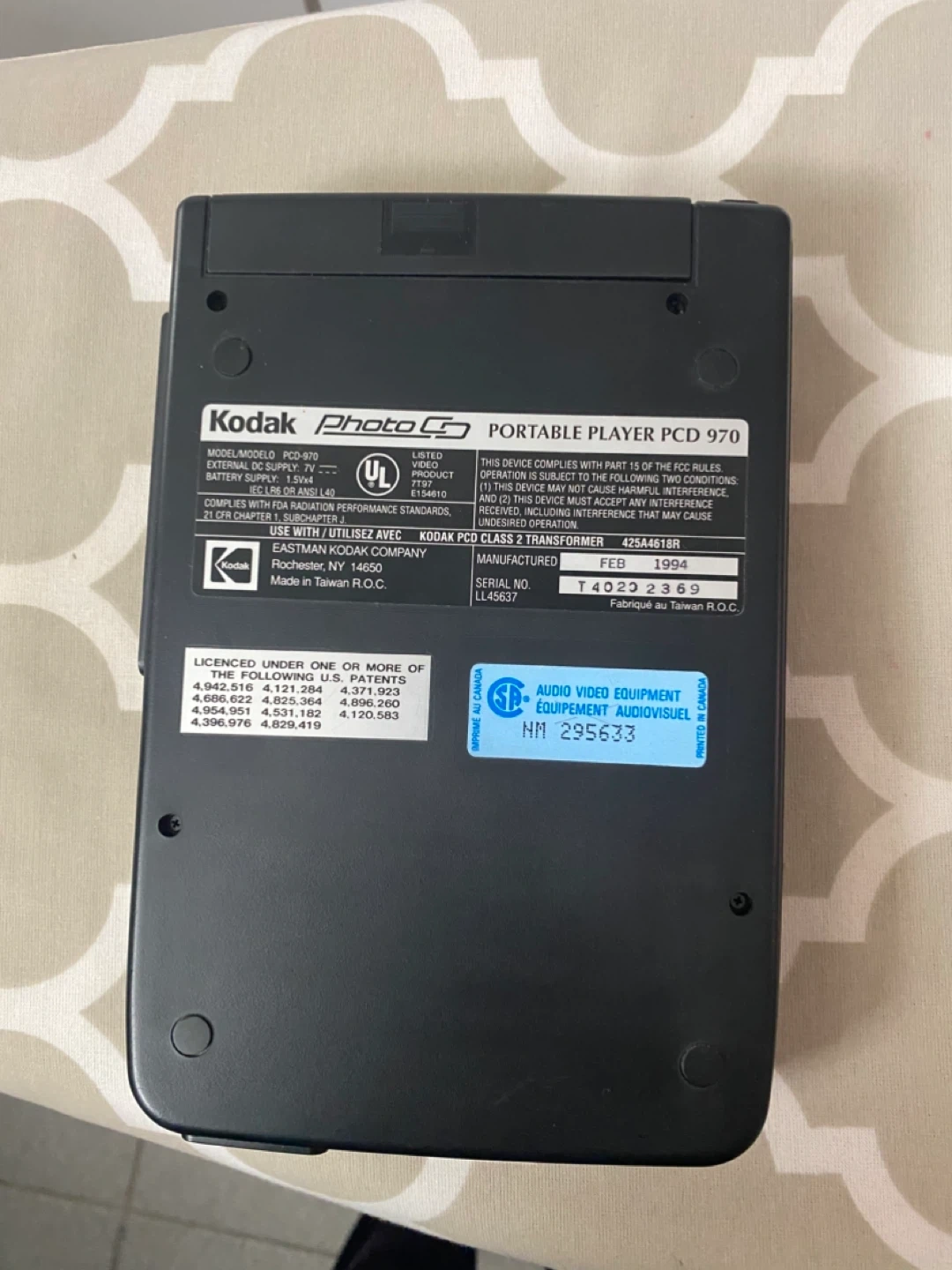 This is a Kodak Photo CD portable player, model PCD 970. It plays digital photo and audio discs. This unit was manufactured in February 1994.