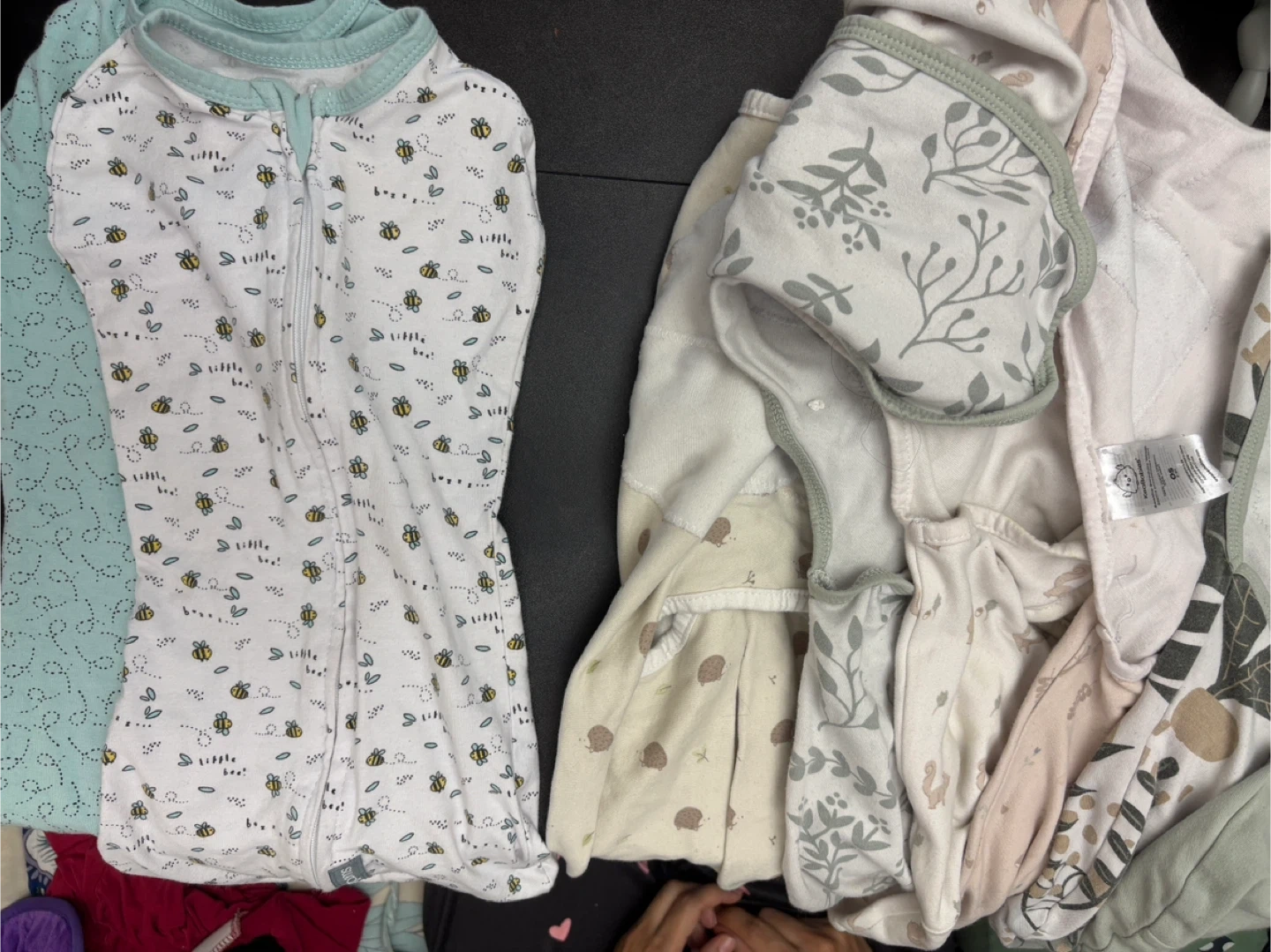 Bundle of baby sleep sacks in various patterns. Includes a bee print sack, a hedgehog print sack, and a floral print sack. Cotton material.