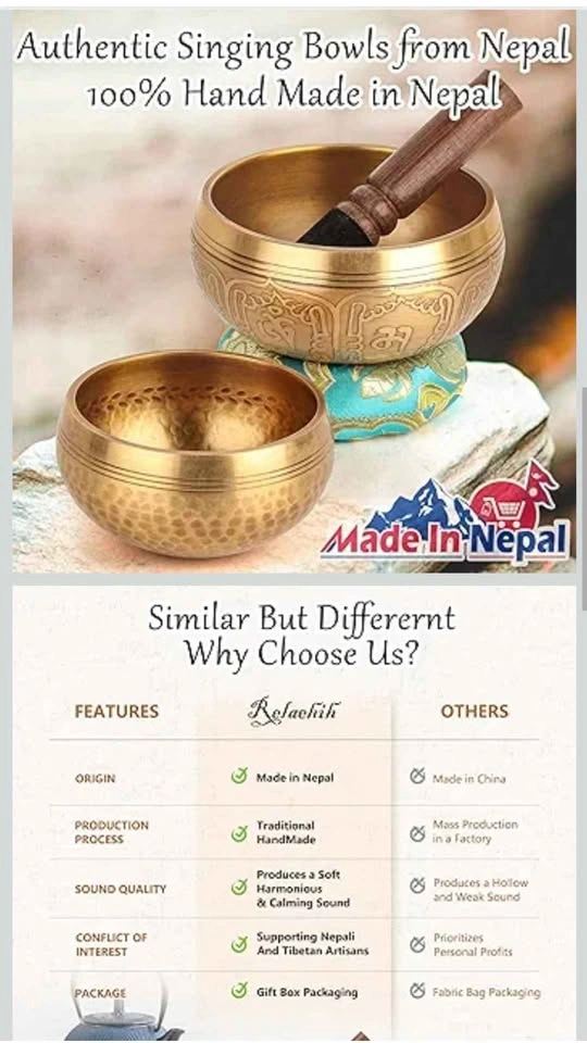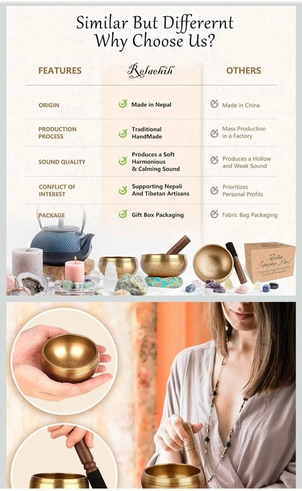 642Pack Tibetan Singing Bowls Set - 100% Handmade in Nepal Sound Bowl Set for Meditation, Yoga, Chakra - Unique Gifts for Women Top highlights ColourBlue BrandRelaehih MaterialBrass Model name178 Item weight0.56 Kilograms Body materialLeather Experience Versatility with Two Singing Bowls: Includes one 4-inch and one 3.15-inch singing bowl, a handcrafted ring cushion, a leather-covered striker, an inspirational card, and a beautifully designed gift box Rooted in Himalayan Heritage: These singing bowls are crafted in Nepal, reflecting deep cultural and historical significance; They are symbols of Eastern philosophy and spirituality Exquisite Peace Flower Design: Crafted by skilled artisans, these bowls feature intricate floral patterns and symbolic designs representing unity and compassion Finely Tuned for Soothing Sound: Each bowl is meticulously tuned to produce calming tones that promote inner peace and spiritual growth; The harmonious pitch is designed to be pleasing to most listeners Versatile Gift Option: Perfect for daily meditation, relaxation, and spiritual practice; It’s an exceptional gift for meditation enthusiasts, yoga lovers, and those with a spiritual inclination Self pick up location Empress walk and yonge street Cash only I also have a 8 inches singing bowl, please see my other listing.