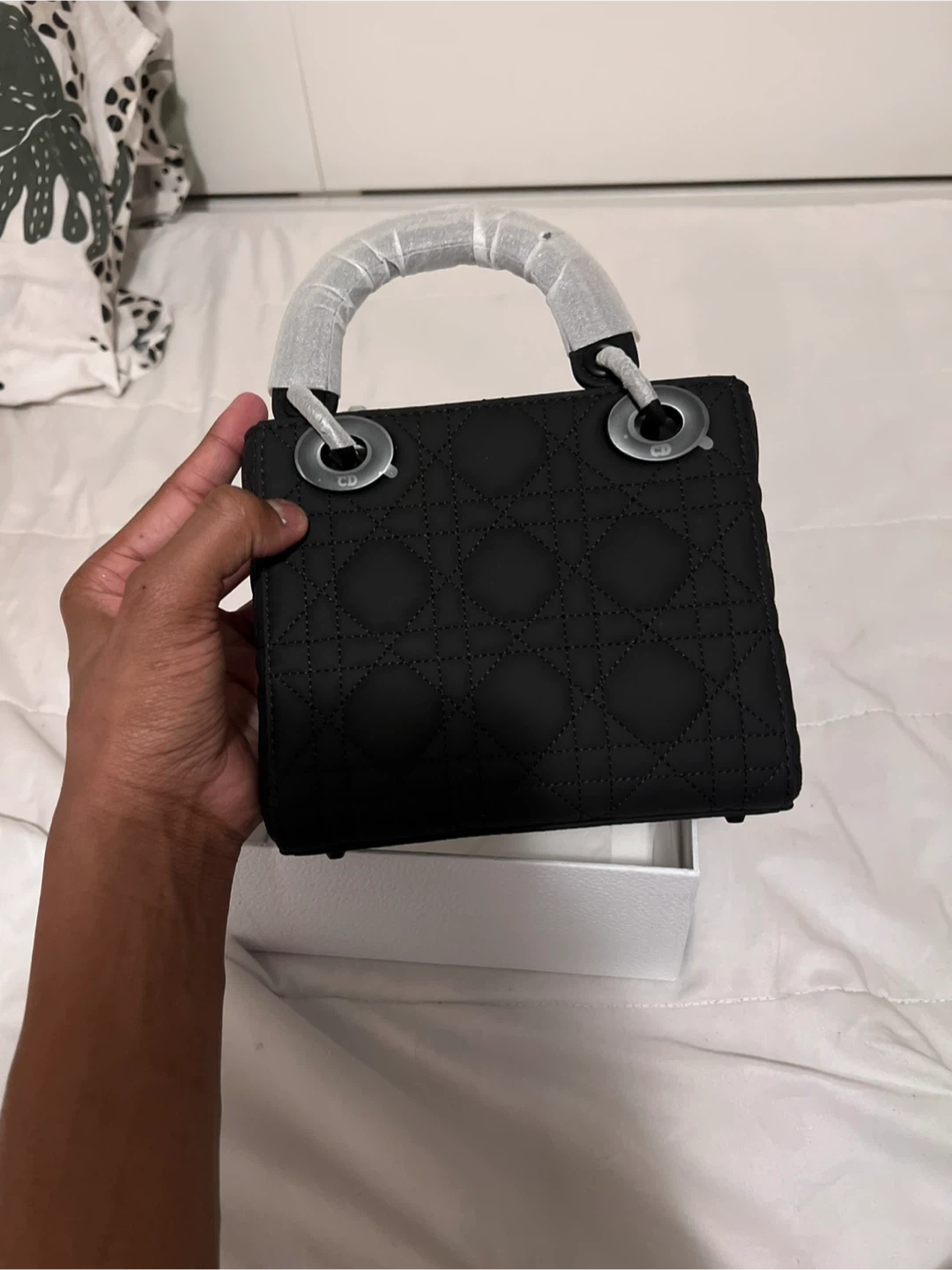 Black quilted leather Lady Dior handbag. Includes original dust bag and box. This iconic bag is a timeless accessory.