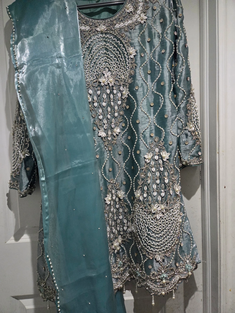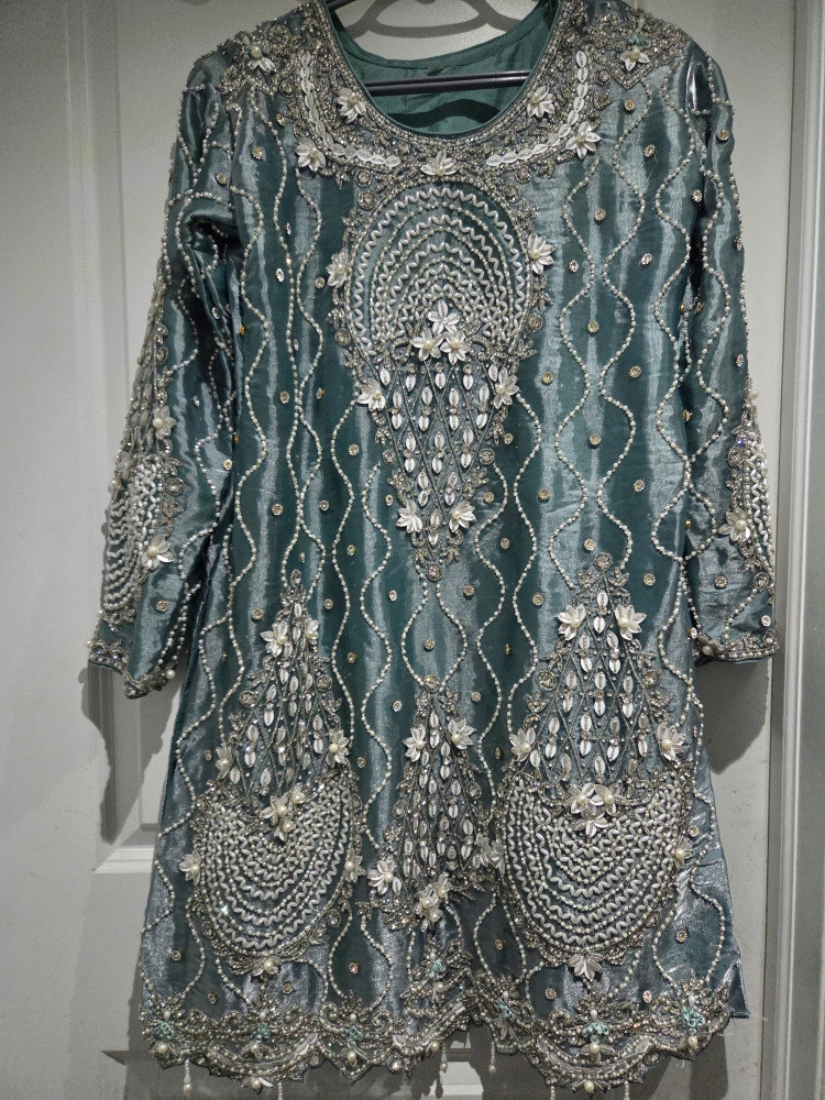 Ready to Wear - Kurti with Dupatta Available in 2 Elegant Colors: Purple & Sea Green Size: XL (Comfortable & Stylish Fit) Heavy Hand Embroidery with Stones & Pearl Work Perfect for Party, Wedding & Special Occasions used like new -just 1 day High-Quality Stitched Dress