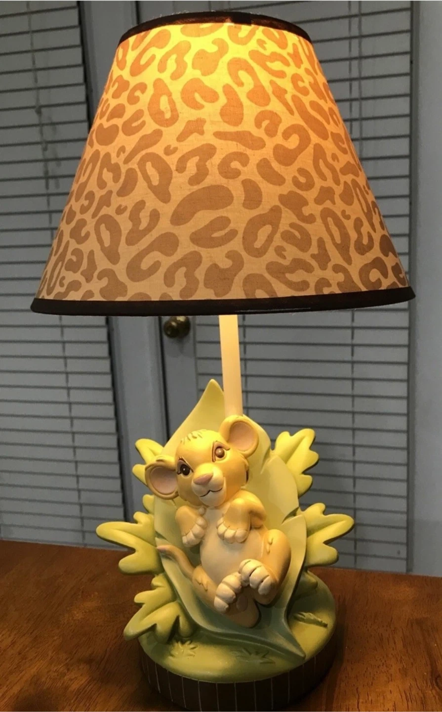 This adorable lamp features Simba from The Lion King nestled in leaves. It's topped with a fun leopard print lampshade. A charming addition for any child's room!