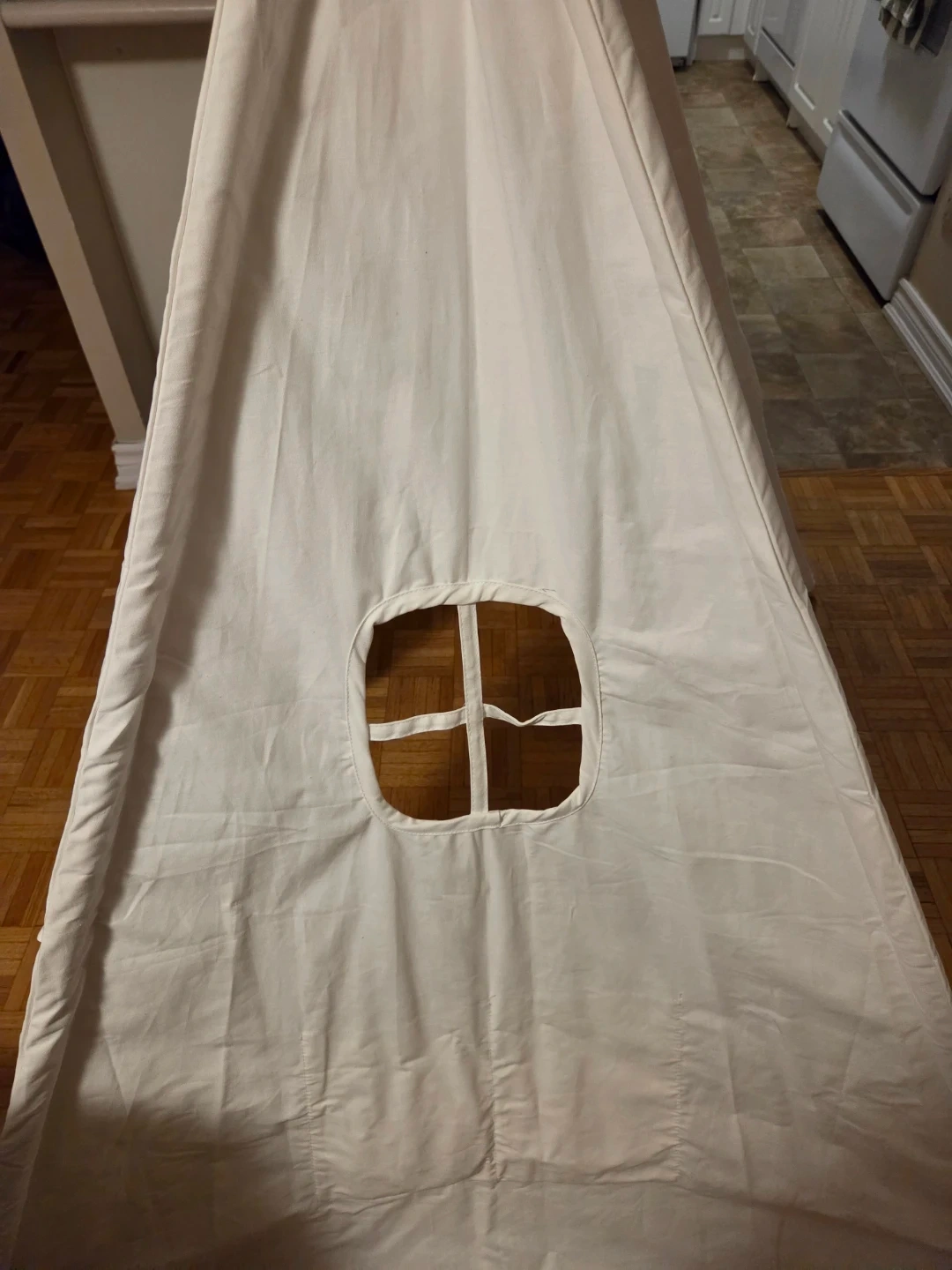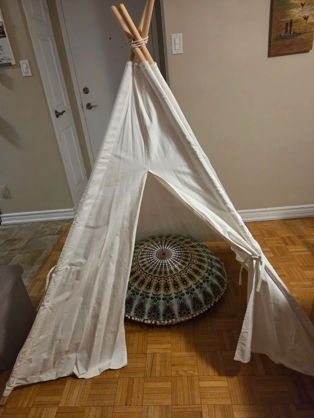 Selling my daughter's (barely used) off white canvas teepee tent. Was purchased as a gift then put in storage due to a move which didnt have space for it. She has now outgrown it, so I am looking to declutter my stoarage space. Includes 4 poles for easy setup and take down, was used indoors only but perfect for indoor and outdoor play. The dimensions are 47.2 inches by 47.2 inches with a height of 61 inches. Asking $35