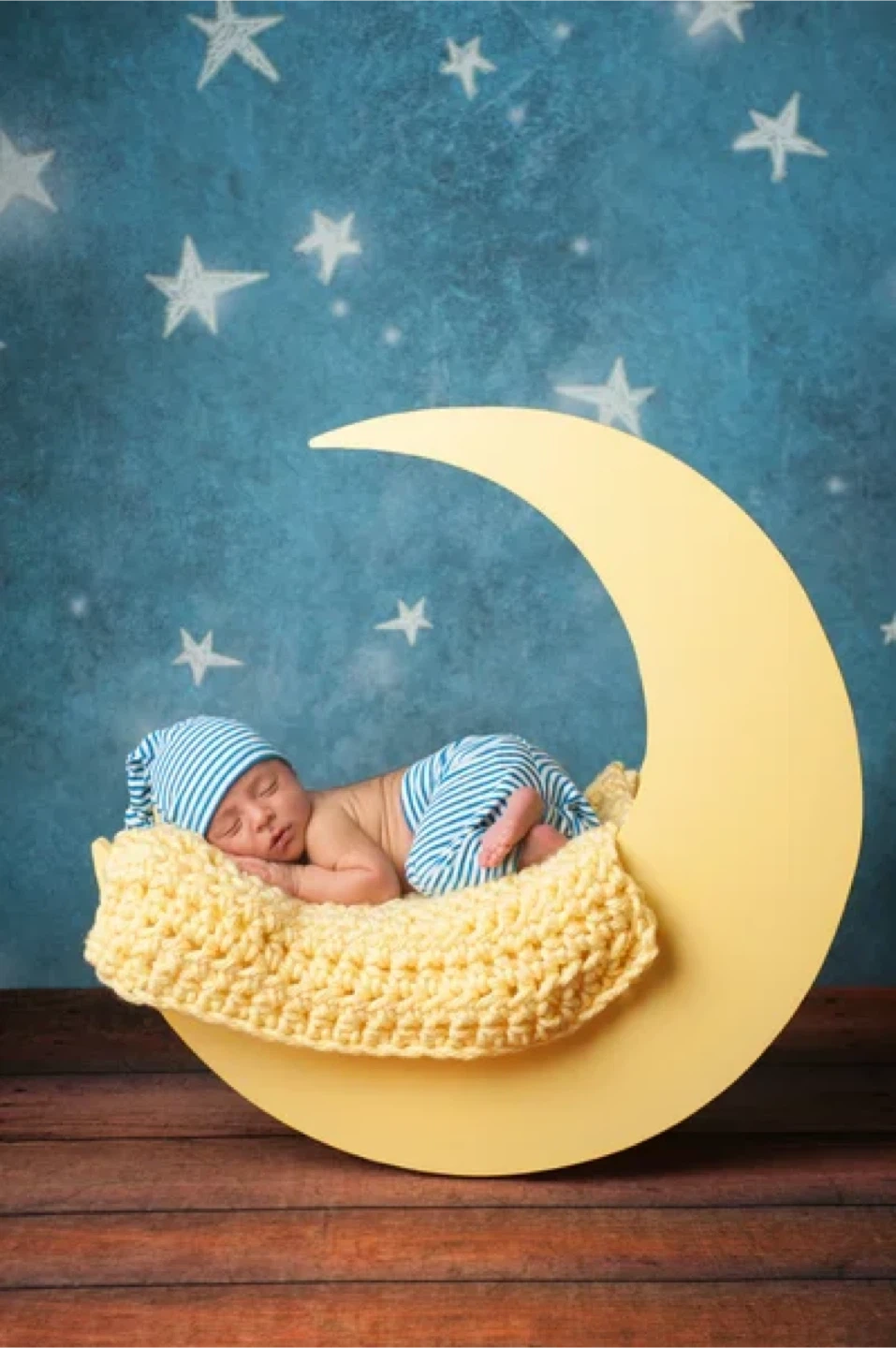 This prop is a beautiful yellow crescent moon, perfect for newborn photography sessions. It's made with a wooden interior and a smooth yellow exterior. Great for creating adorable celestial-themed baby photos! Available for RENTAL pick up in North Babylon Long Island.