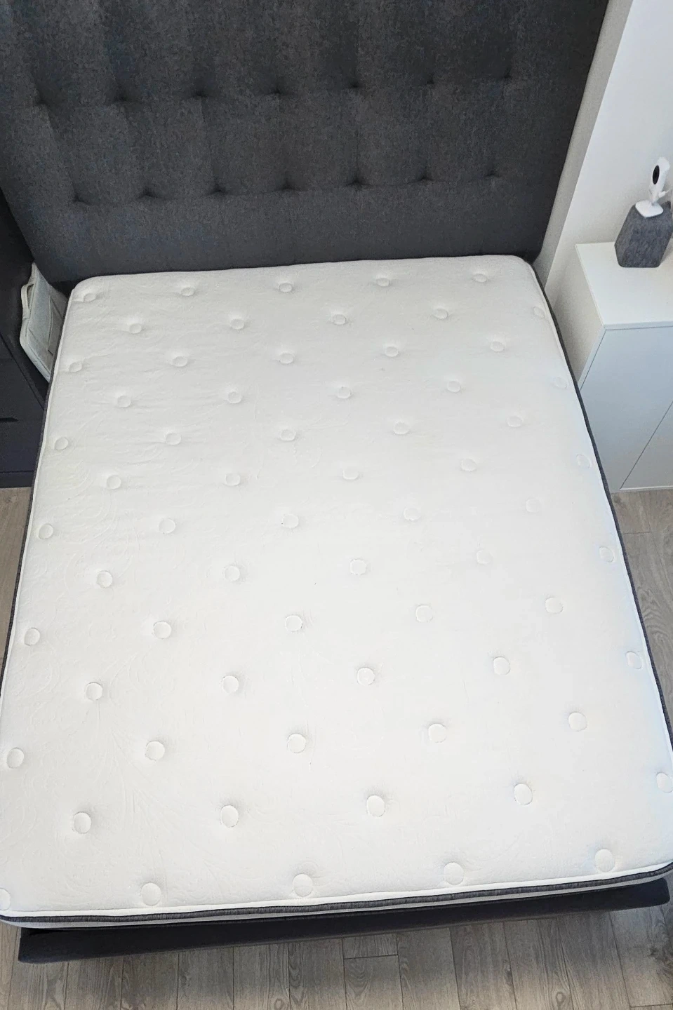 This is a Beautyrest mattress. It has a quilted top surface with a patterned design. The sides feature a textured fabric with a dark grey trim. Hardly used, always protected using a mattress topper.