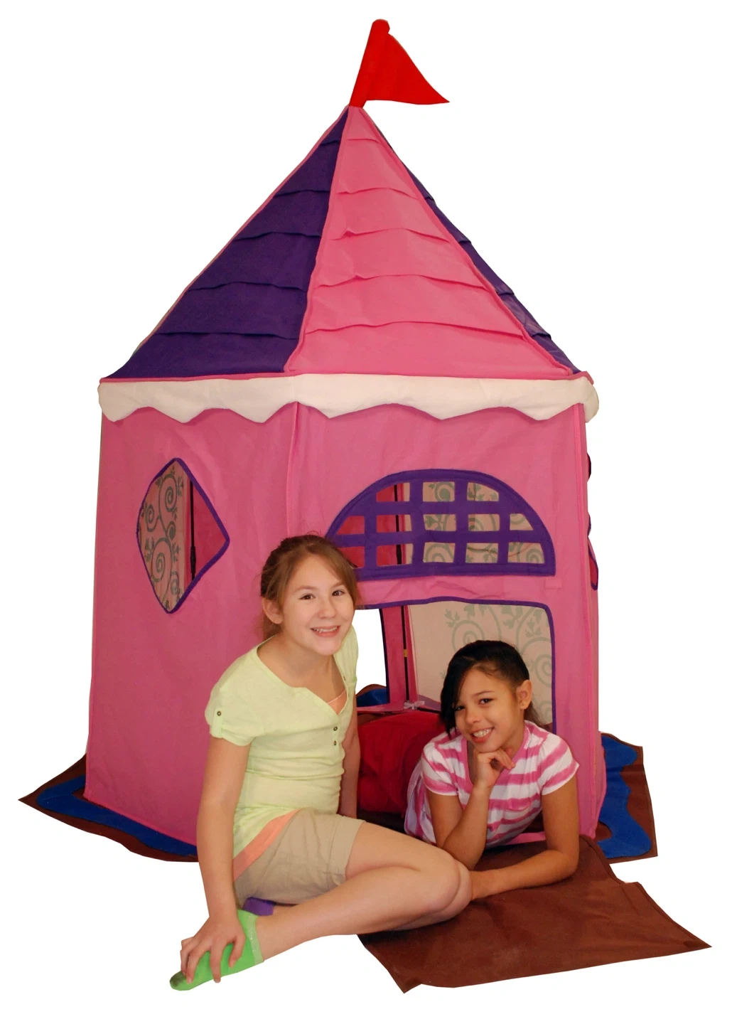 This adorable pink princess castle play tent is perfect for imaginative play. It features purple accents and a red flag on top. Made from durable fabric, it's designed for indoor fun! It's a great addition to any child's playroom.