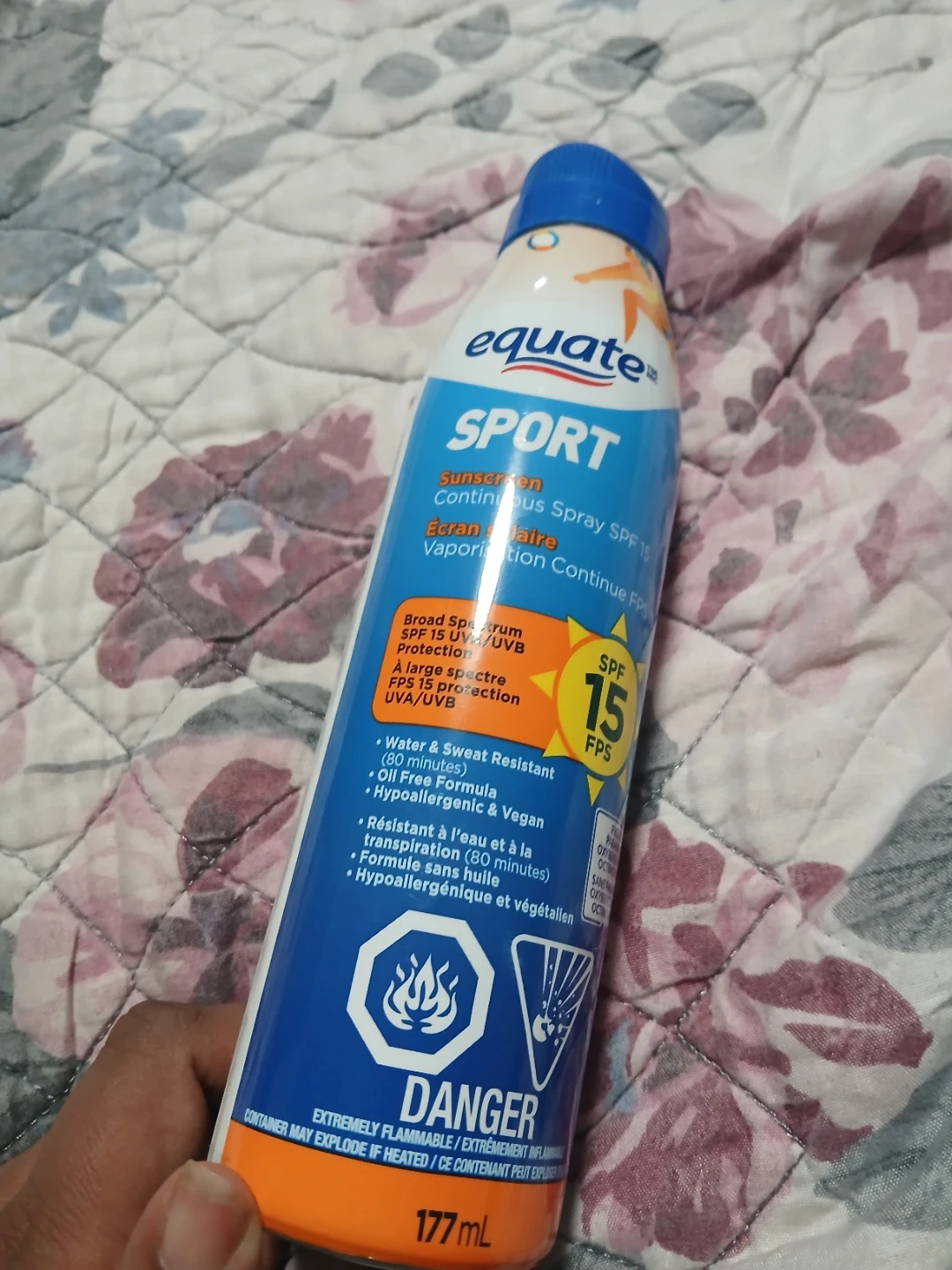 This Equate Sport continuous spray offers SPF 15 protection. It's water and sweat resistant for up to 80 minutes, oil-free, hypoallergenic, and vegan. The formula is also broad-spectrum UVA/UVB protection. It's extremely flammable and the container may explode if heated. Price is firm plz. Pick up midland and Danforth or 401 bay street