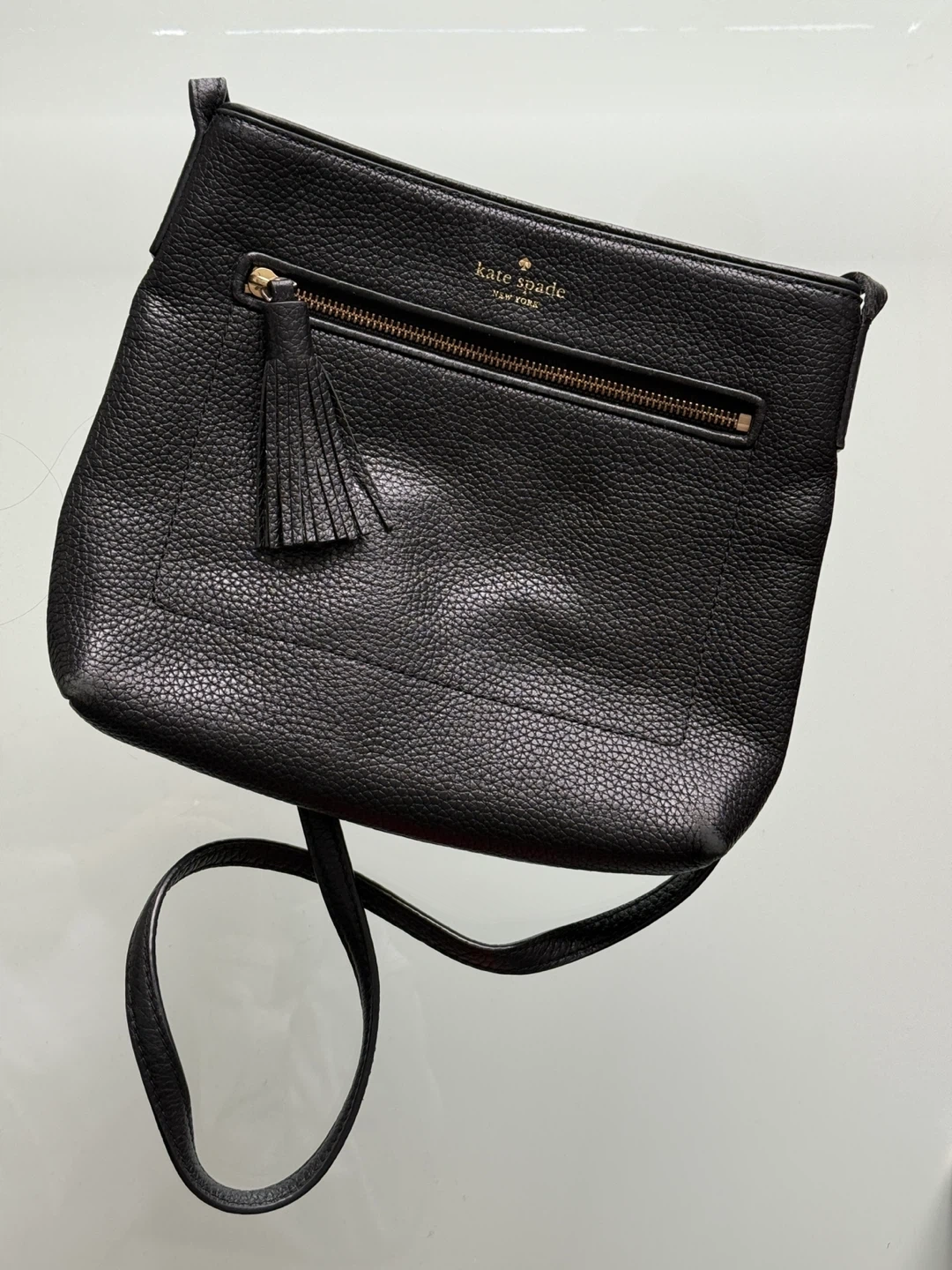 This is a black pebbled leather crossbody bag from Kate Spade New York. It features a front zip pocket with a tassel detail and an adjustable shoulder strap. The interior is lined and includes pockets for organization.