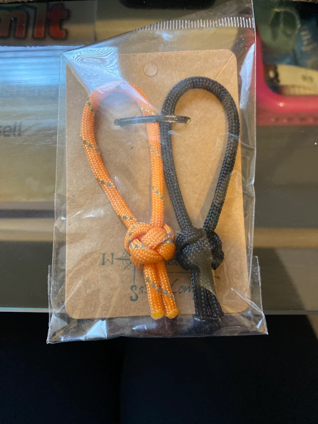 Two durable paracord keychains, one orange and one black. Each is braided with reflective threading for visibility. They're handy for attaching keys or other gear to your pack or belt loop!