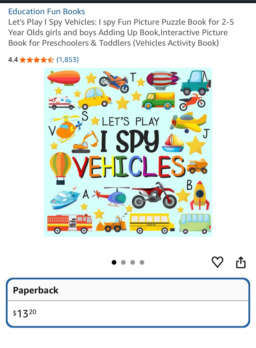 This is a fun 'I Spy' picture puzzle book featuring various vehicles. It's suitable for preschoolers and toddlers. Great for developing observation skills!