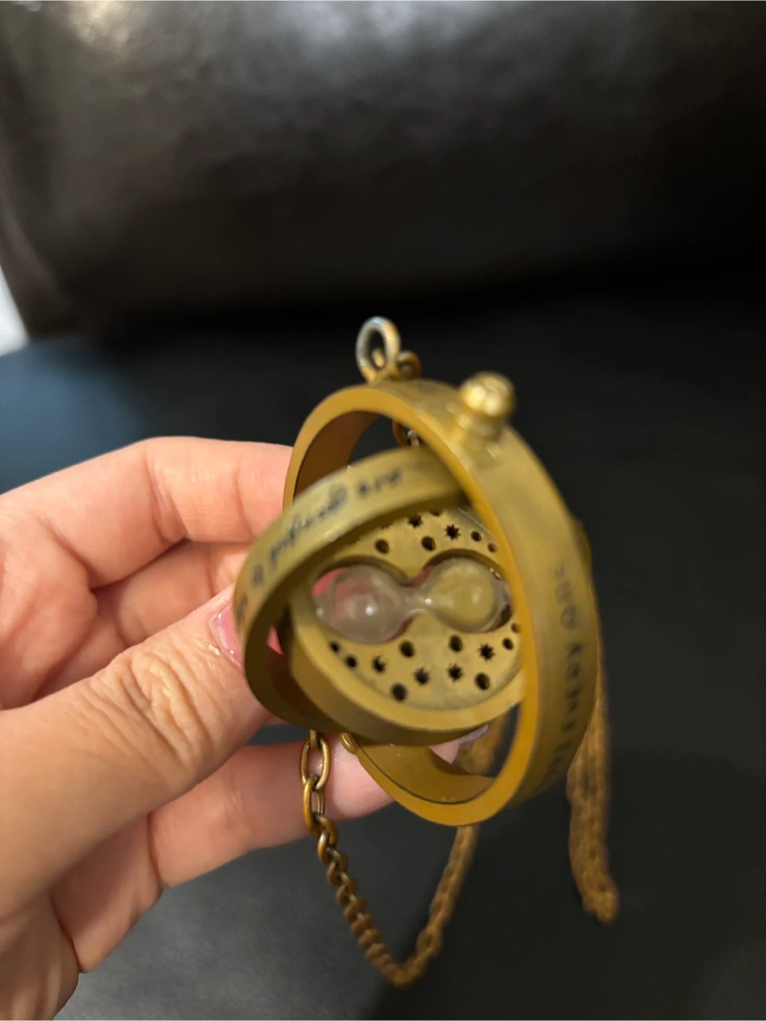 This gold Time Turner necklace features a spinning hourglass and engraved quotes. It's a classic replica accessory.