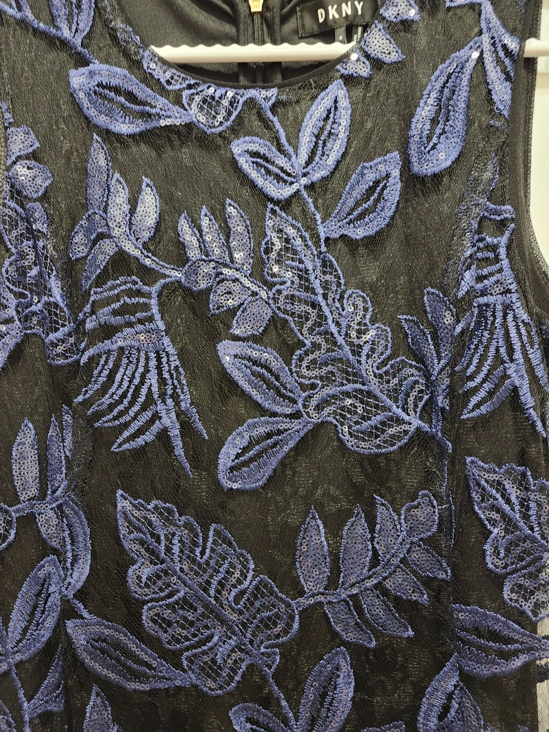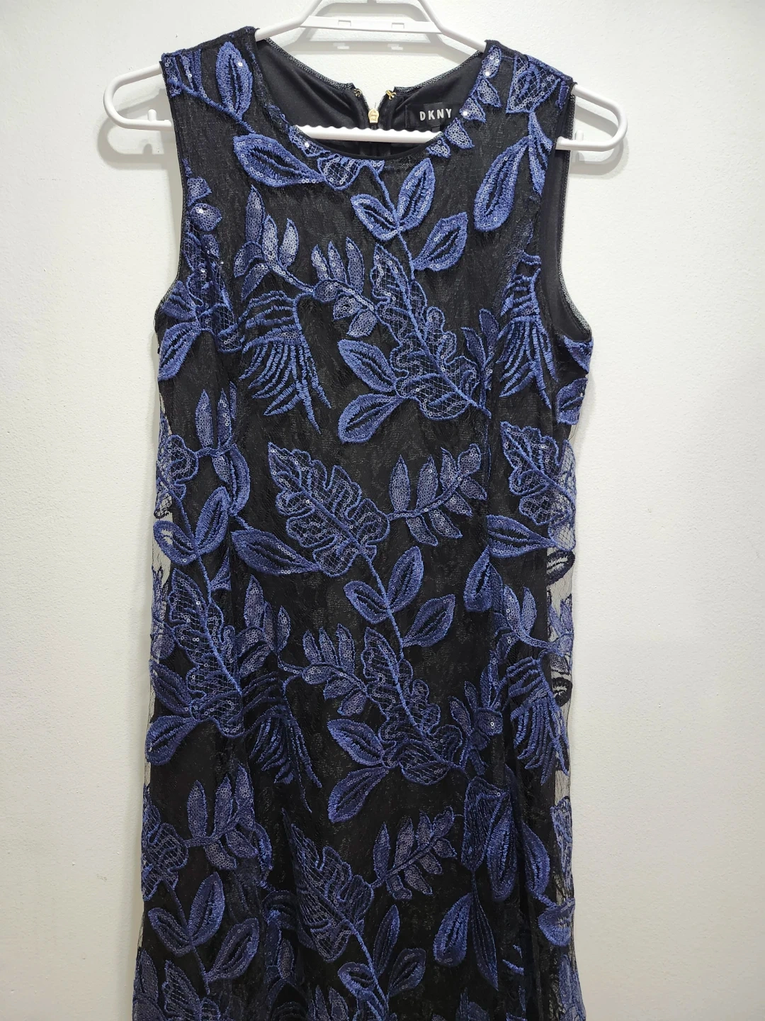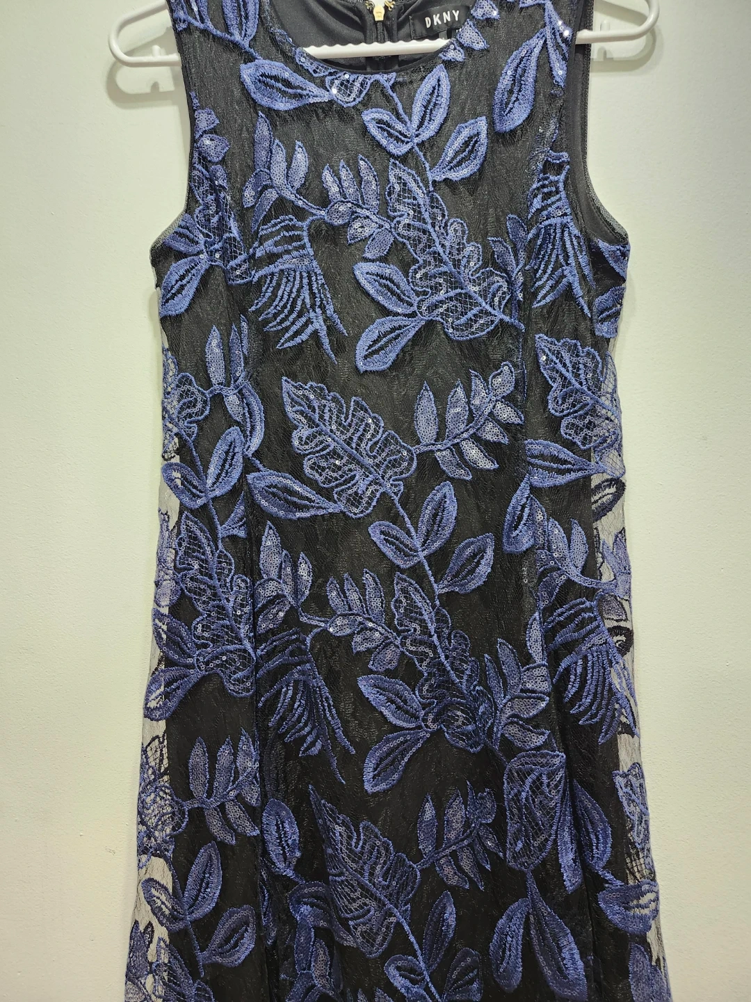 DKNY sleeveless dress with black lace overlay. Features blue floral embroidery and sequins. Zipper closure at back. Size is 4.
