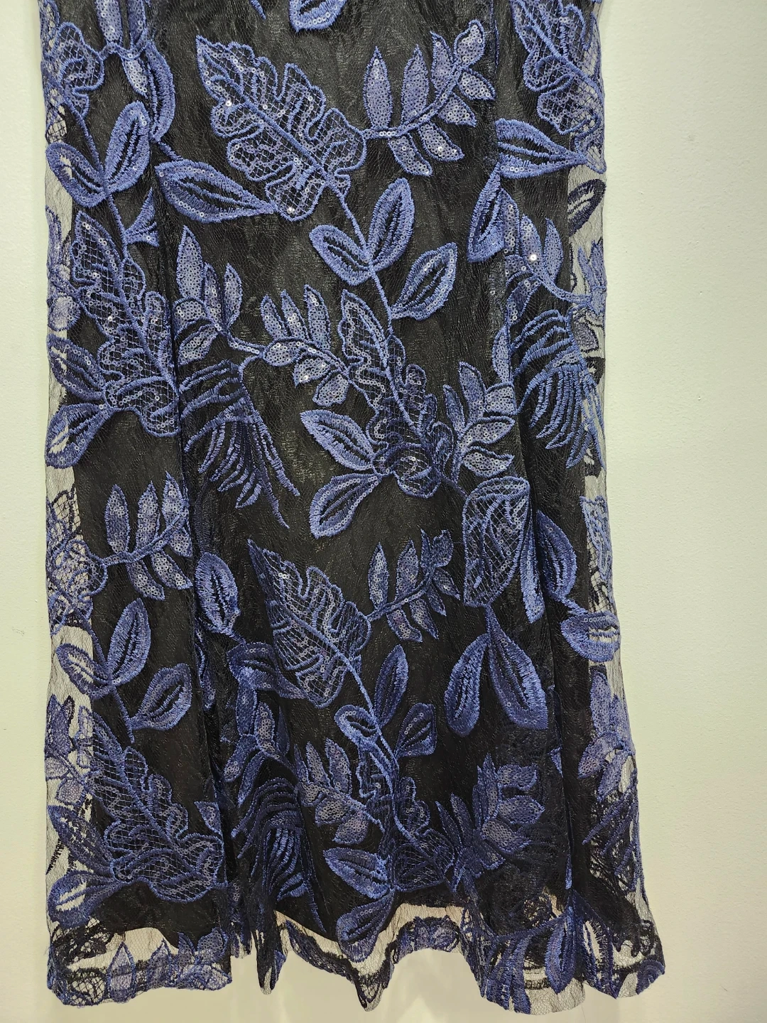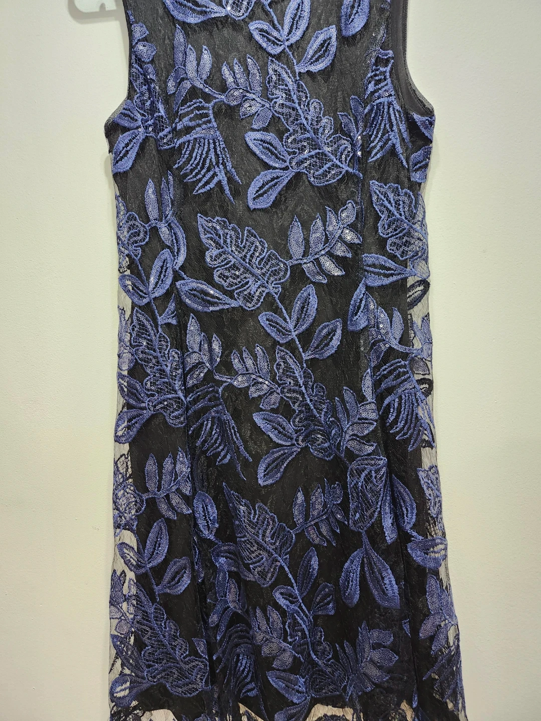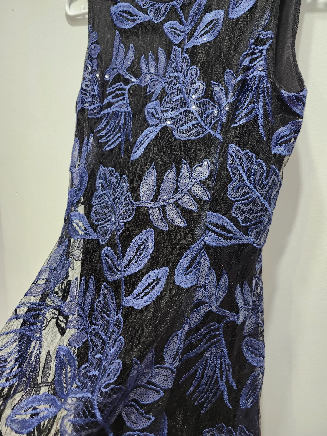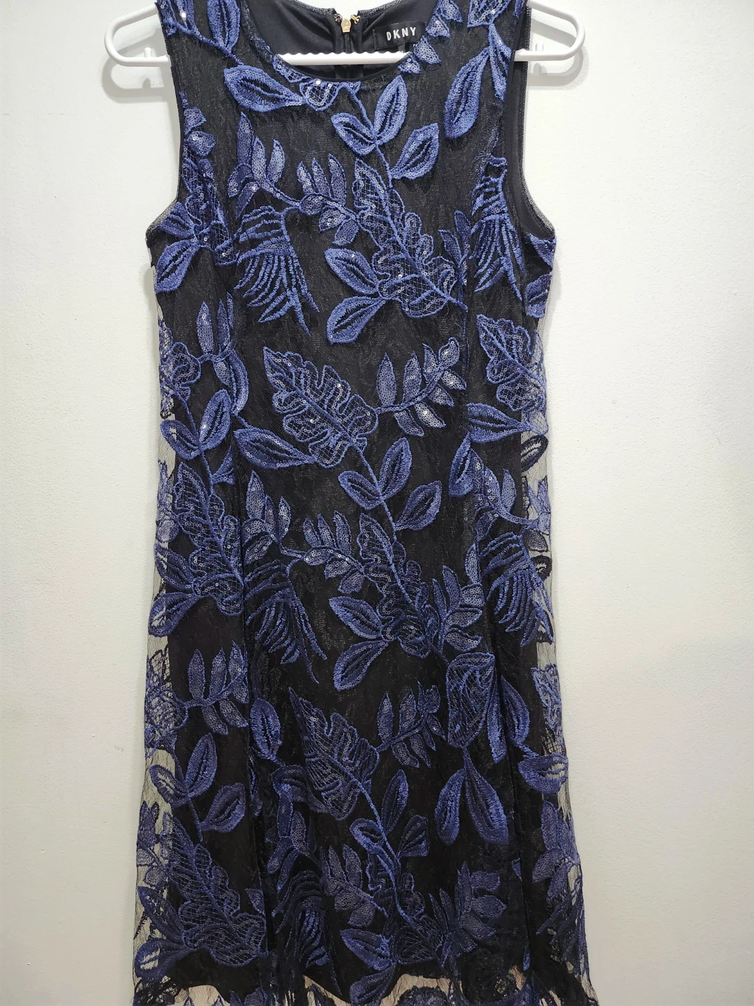 DKNY sleeveless dress with black lace overlay. Features blue floral embroidery and sequins. Zipper closure at back. Size is 4.