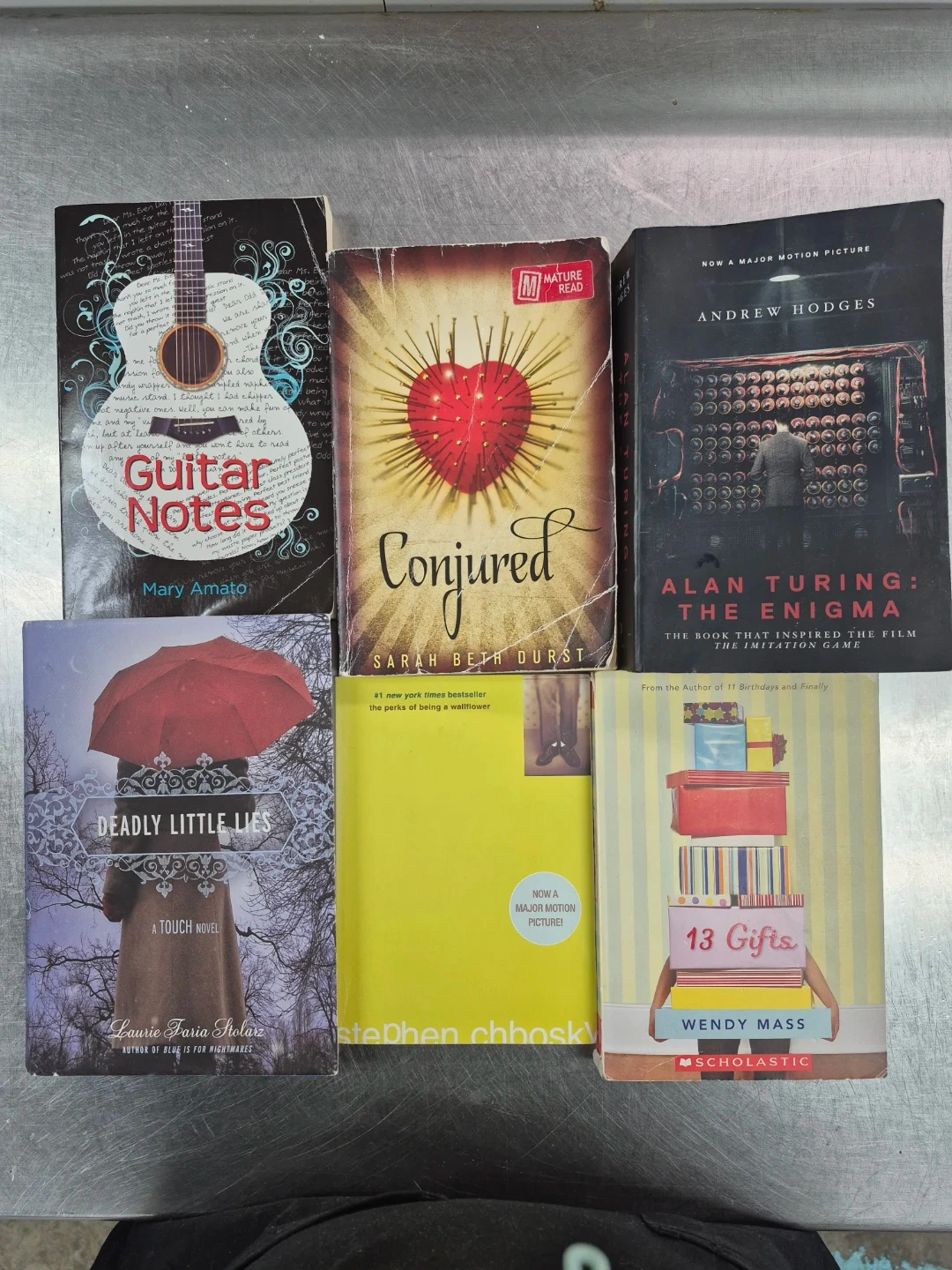 This lot includes 'Guitar Notes' by Mary Amato, 'Conjured' by Sarah Beth Durst, 'Alan Turing: The Enigma' by Andrew Hodges, 'Deadly Little Lies' by Laurie Faria Stolarz, 'The Perks of Being a Wallflower' by Stephen Chbosky, and '13 Gifts' by Wendy Mass. Several are movie tie-ins. These are paperback books. All for $30