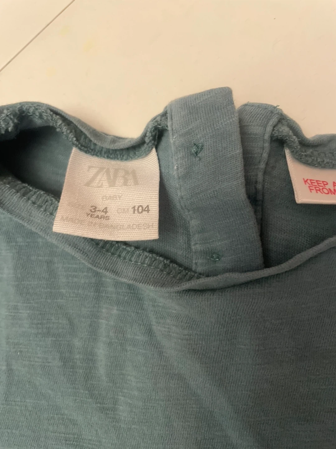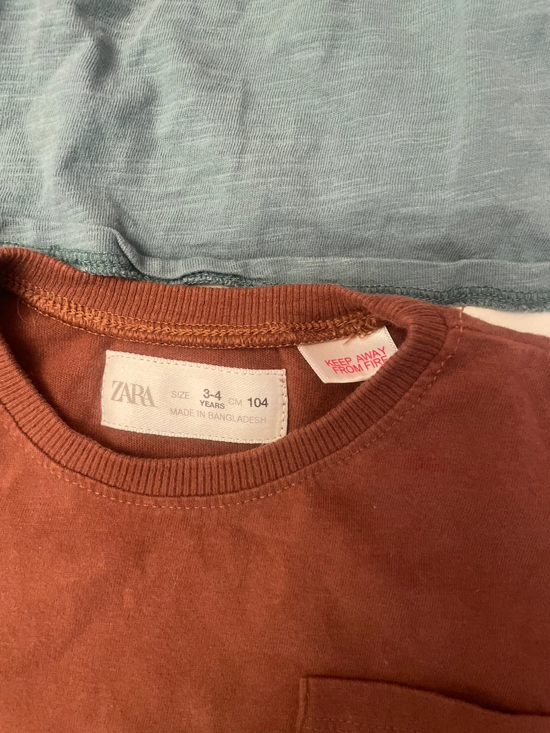 Two long sleeve tops from Zara Baby. One in teal with a ruffled detail and the other in rust with a chest pocket. Both are size 3-4 years, which corresponds to 104cm.