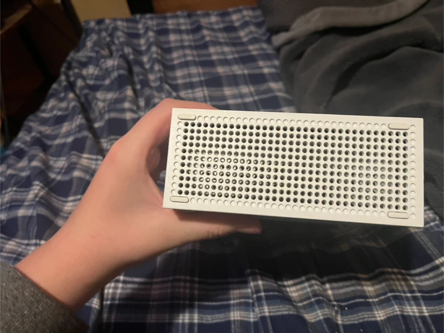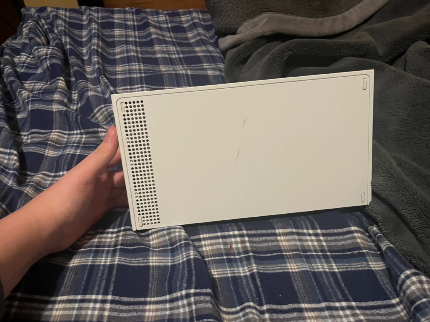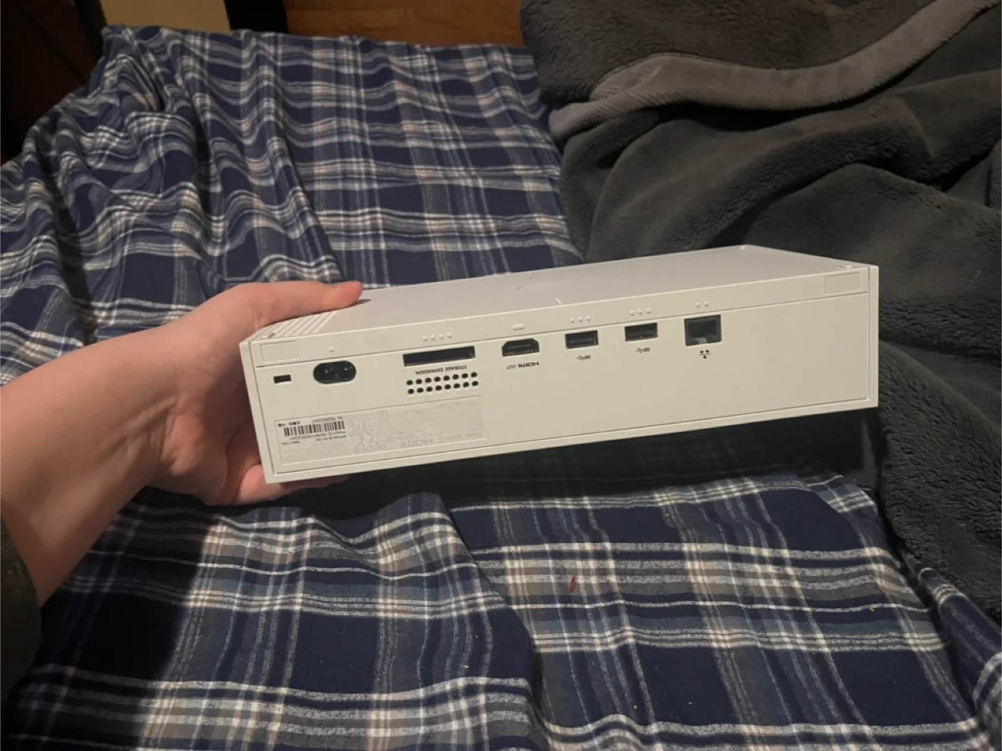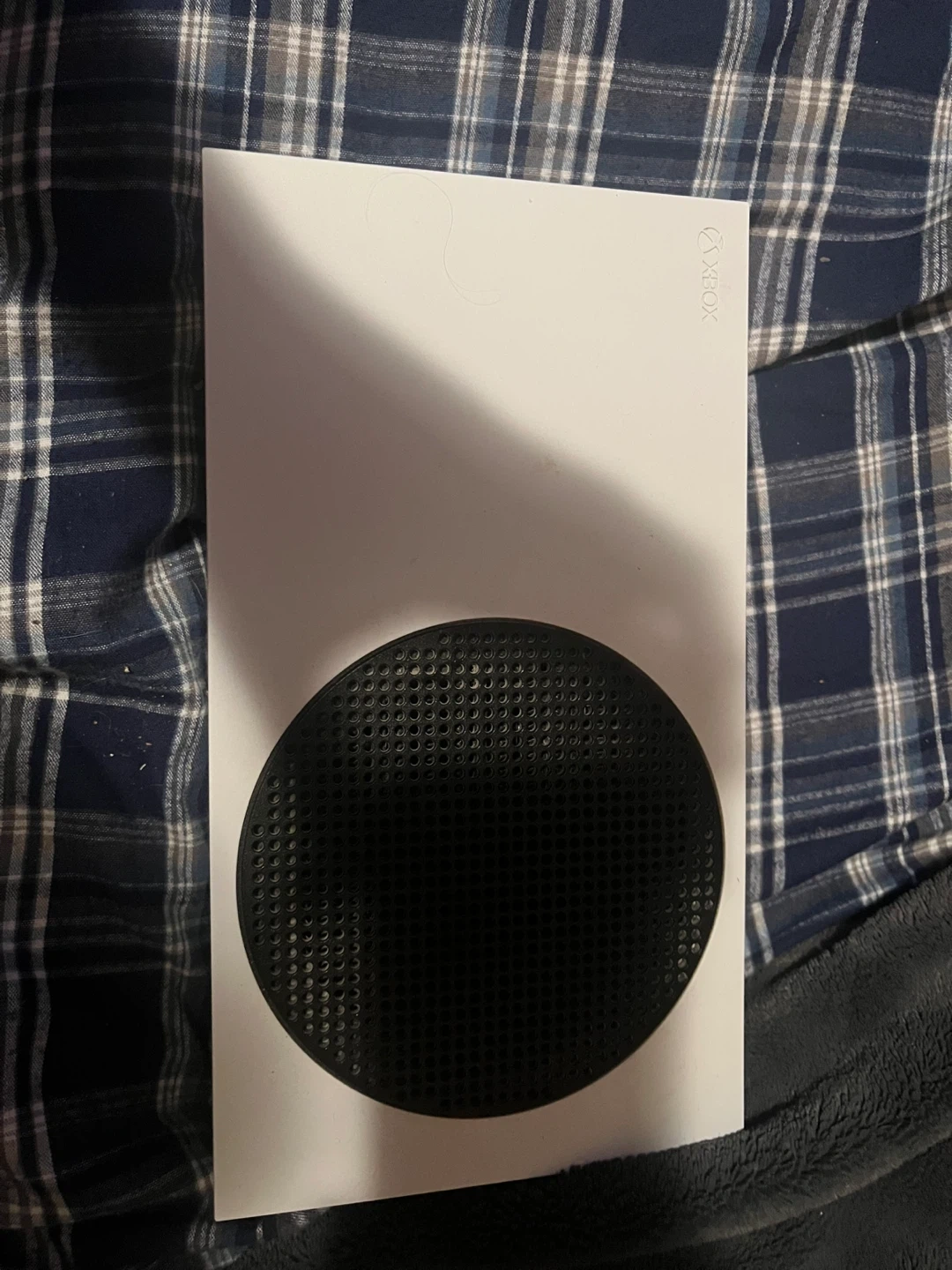 It's a white Xbox Series S gaming console. It has a USB port and a power button on the front. It features multiple ports on the back for connectivity. This console is great for playing games.