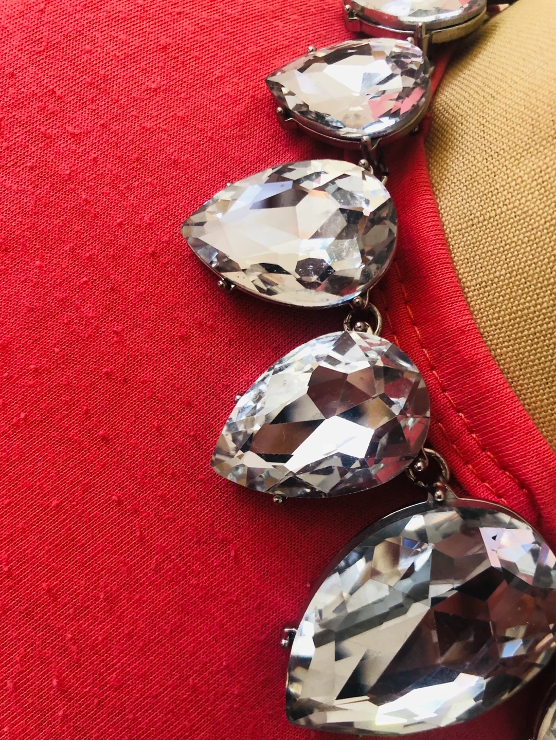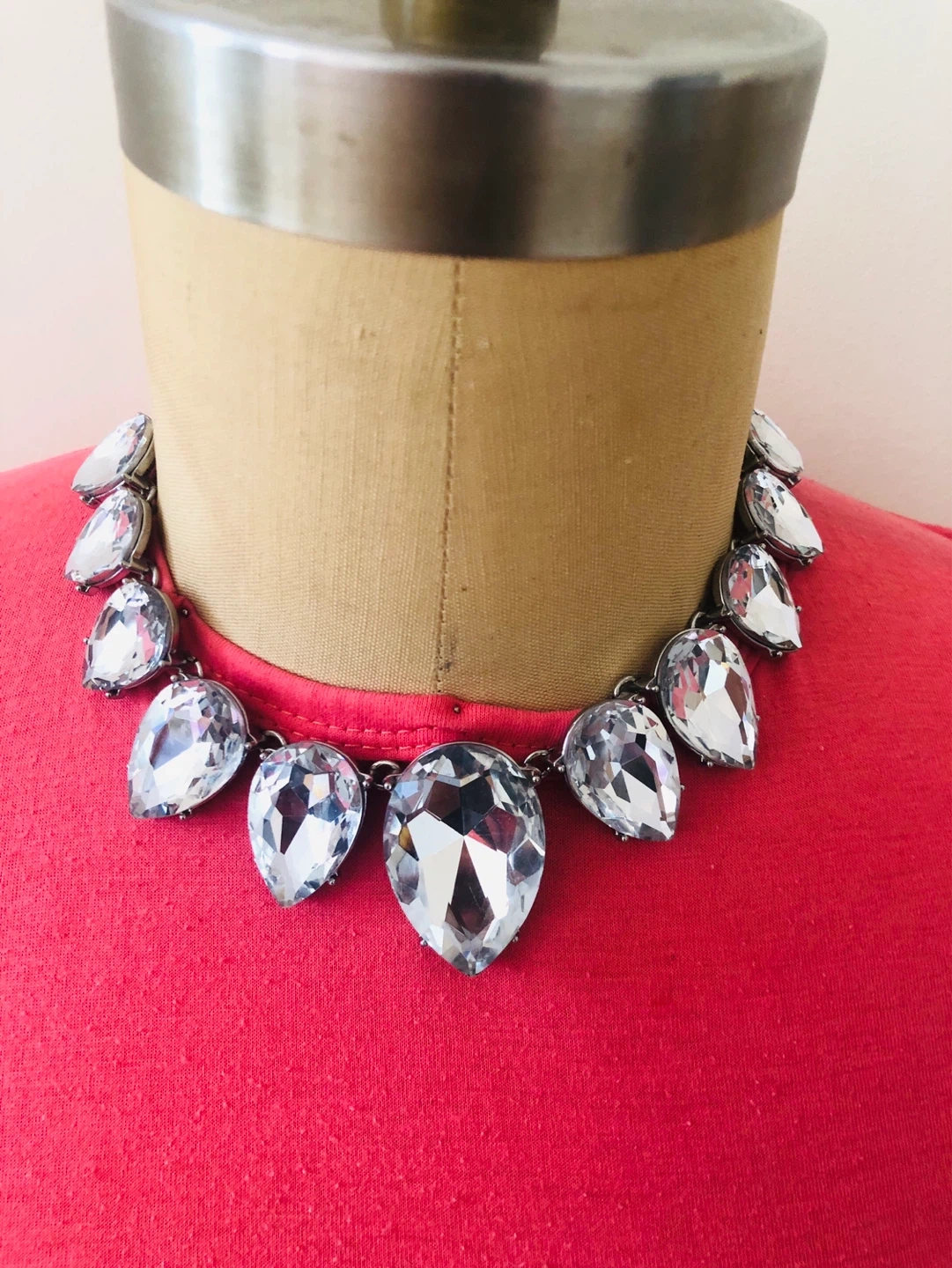 Chunky silver tone necklace. Features large clear teardrop-shaped rhinestones. Fastens with a lobster clasp. Brand tag included.