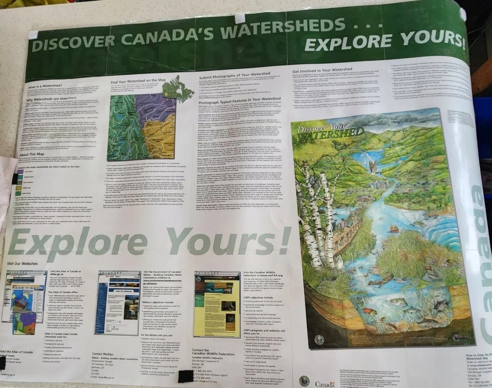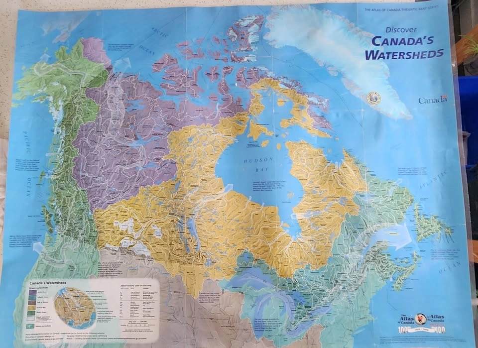 This map shows the major ocean watersheds of Canada, illustrating where all surface water across the country eventually drains. Produced by Natural Resources Canada and the Canadian Wildlife Federation, it depicts a hierarchy of 594 connected watersheds grouped into five massive ocean-draining landscapes. The map uses distinct colors to identify the five primary ocean drainage areas: Yellow for the Hudson Bay Watershed, Purple/Orange for the Arctic Ocean Watershed, Green for the Pacific Ocean Watershed, Light Blue/Cyan for the Atlantic Ocean Watershed, and Small Tan/Yellow for the Gulf of Mexico Watershed. The lower-left corner contains a detailed legend explaining these color codes and showing the hierarchy of sub-watersheds. These boundaries act as "drainage divides." Map details: Scale typically 1:4,000,000. Located in St. Catharines near Western Hill. Door/porch pick up and cash only.