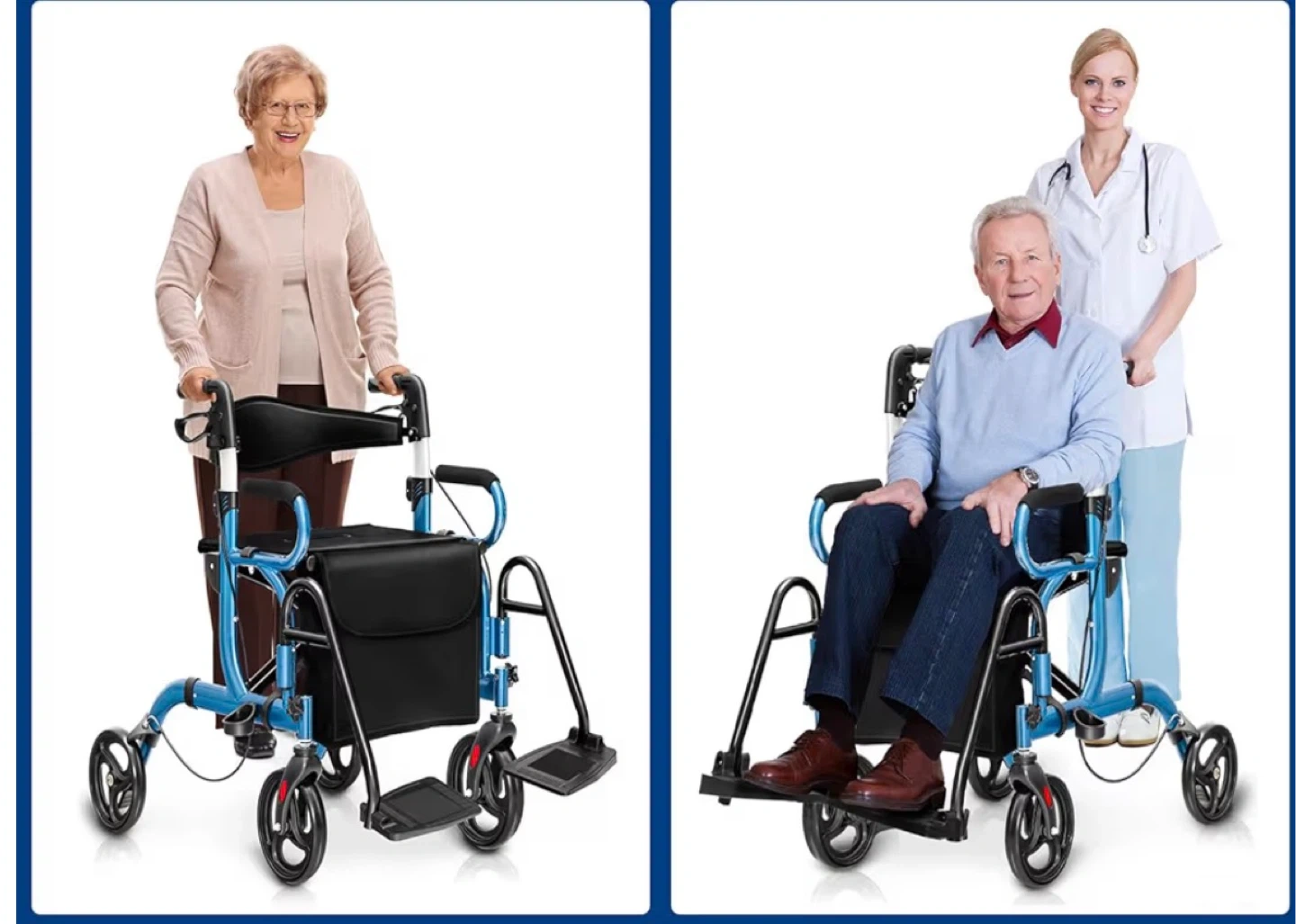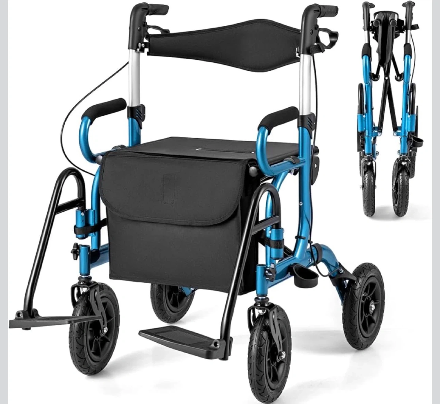 This walker features 6 adjustable height levels and a reversible backrest for customized comfort. It also includes foldable footrests and a seat with a bag for convenience. It's designed for mobility assistance, offering support and ease of use.