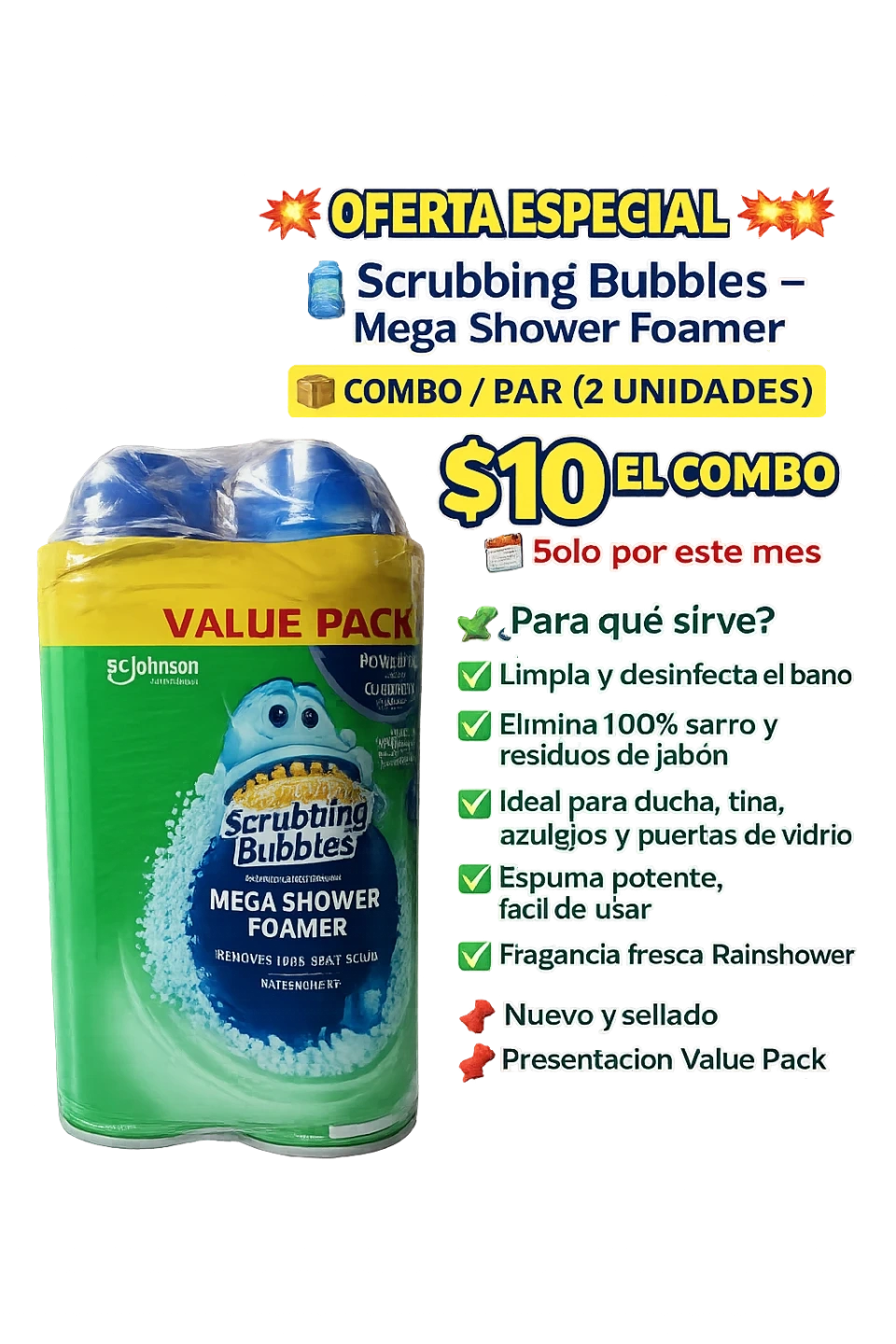 This is a value pack of two Scrubbing Bubbles Mega Shower Foamers. It cleans and disinfects the bathroom, removing soap scum and grime. The foamer has a powerful, easy-to-use foam and a fresh Rainshower scent.