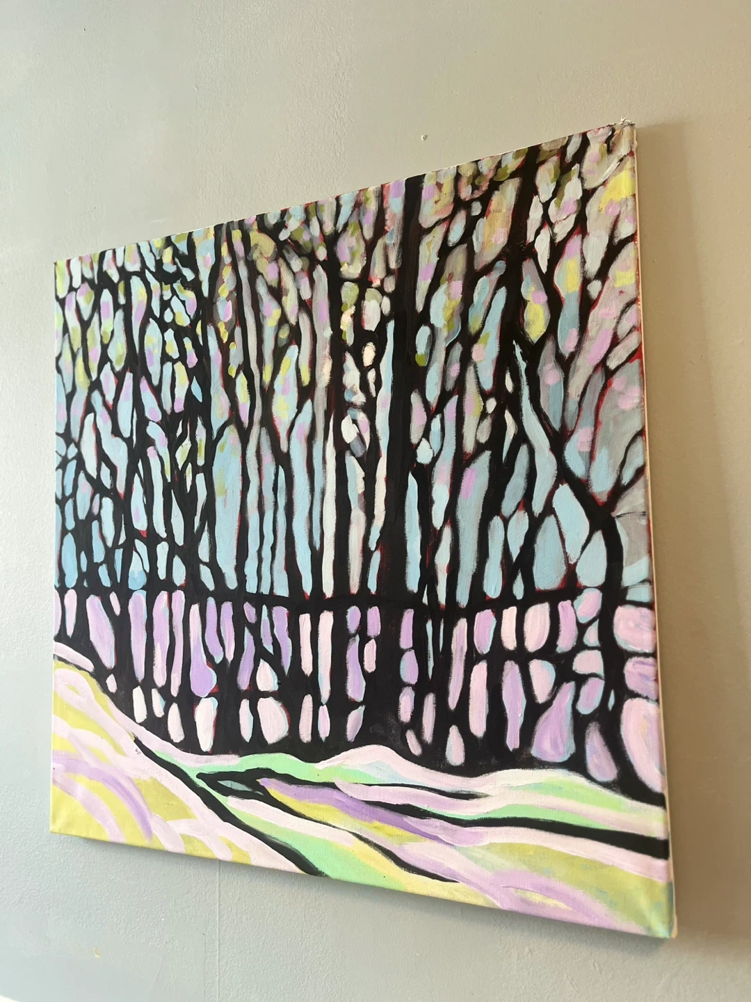 This is an original abstract acrylic painting on canvas depicting a forest landscape in Algonquin. It features a stylized rendition of trees with a pastel colour palette for the snow and sky. Adds a pop of colour to any room!