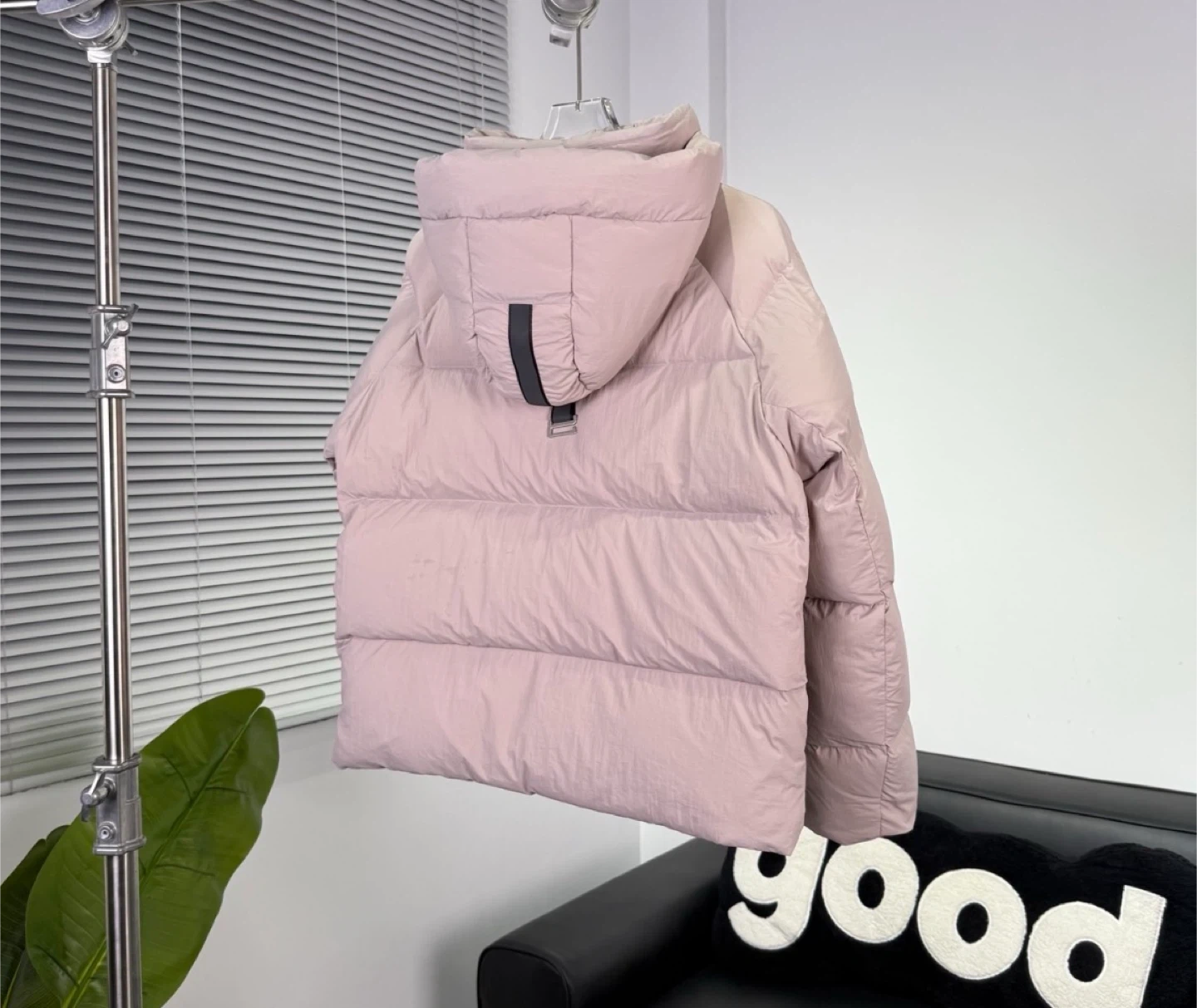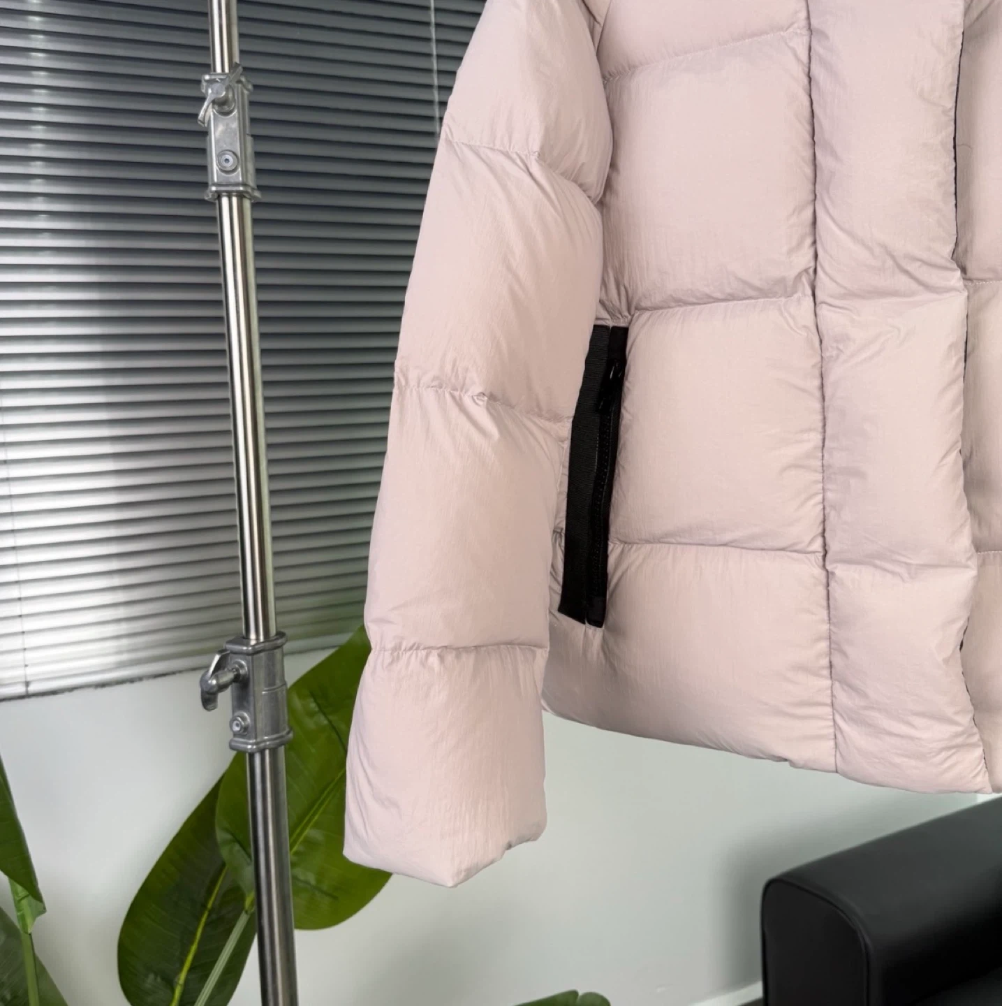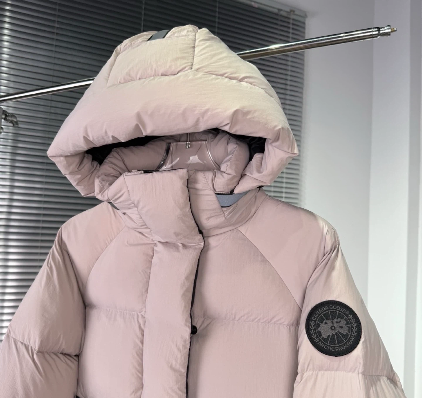 This Canada Goose puffer jacket is a lovely shade of pink. It's designed for warmth and comfort. It features a full zip closure and a cozy hood.