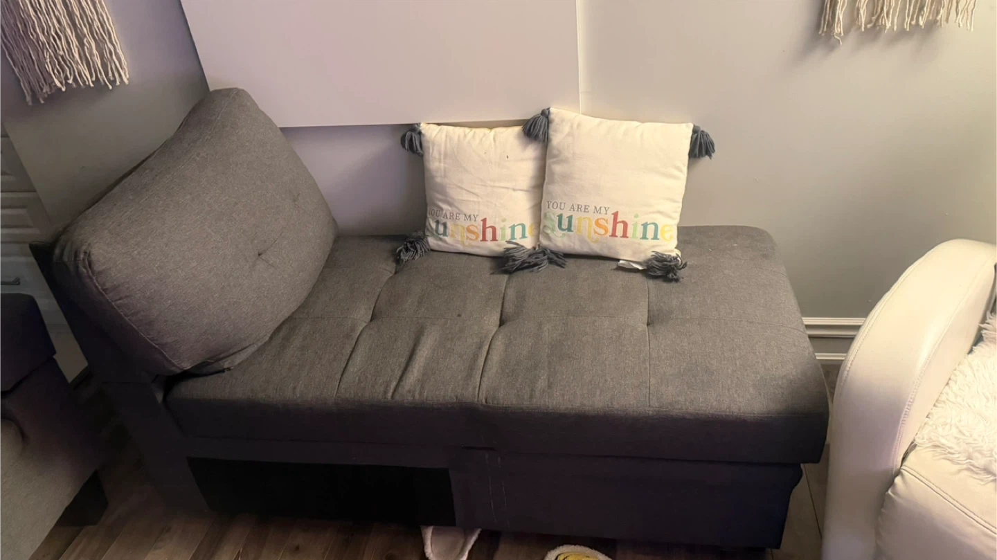 Selling this versatile grey fabric chaise lounge. It’s perfect for a living room, office, or nursery. Very comfortable for lounging and includes a hidden storage box underneath for blankets, pillows, or toys.