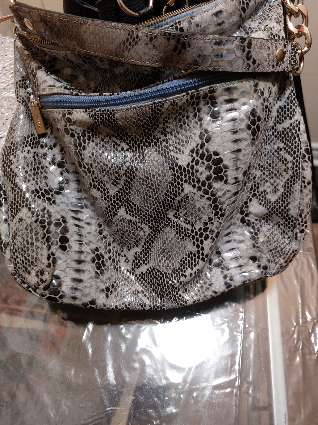 DANIER women's shoulder bag featuring a snakeskin print. It's got multiple compartments inside for organization. The faux leather material is durable and easy to clean. This bag is great for everyday use!