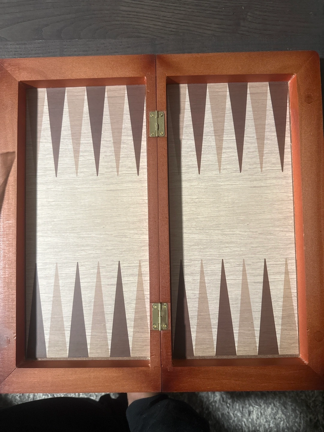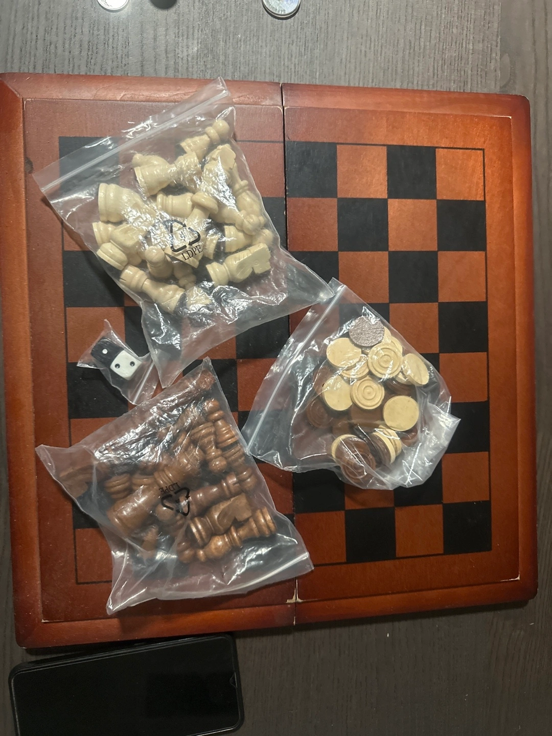 Foldable wooden chessboard. Includes two sets of chess pieces, one light and one dark. Extra checkers pieces also included. All pieces in individual ziplock bags.