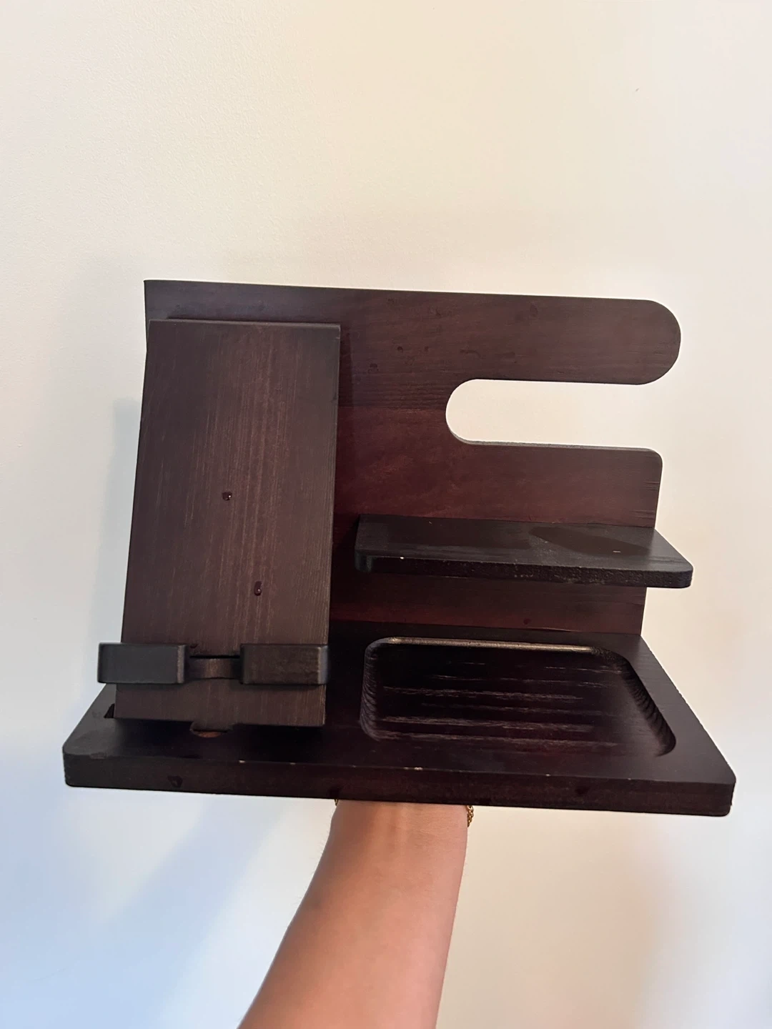 This wooden desk organizer holds your phone, wallet, and keys. It has a dedicated slot for your phone and a tray for smaller items. Keep your essentials tidy!