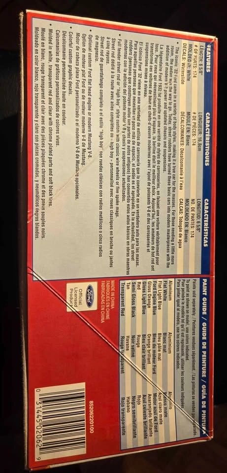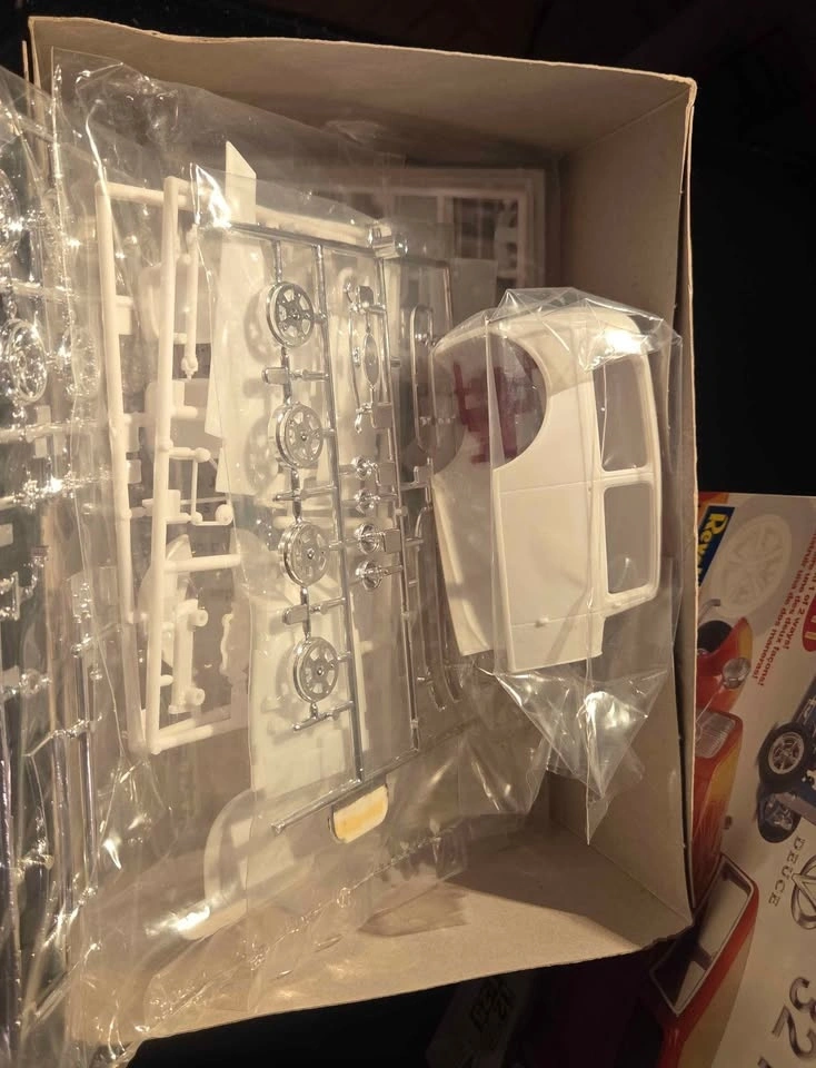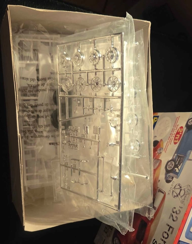 Cool Revell '32 Ford Sedan Street Rod plastic model kit. This one is a 2 in 1 kit so you can build it two different ways! It's 1:25 scale and has 174 parts. Parts are molded in white, transparent red, clear, with chrome pieces and soft black tires. Kit is unassembled and parts are still sealed in bags.