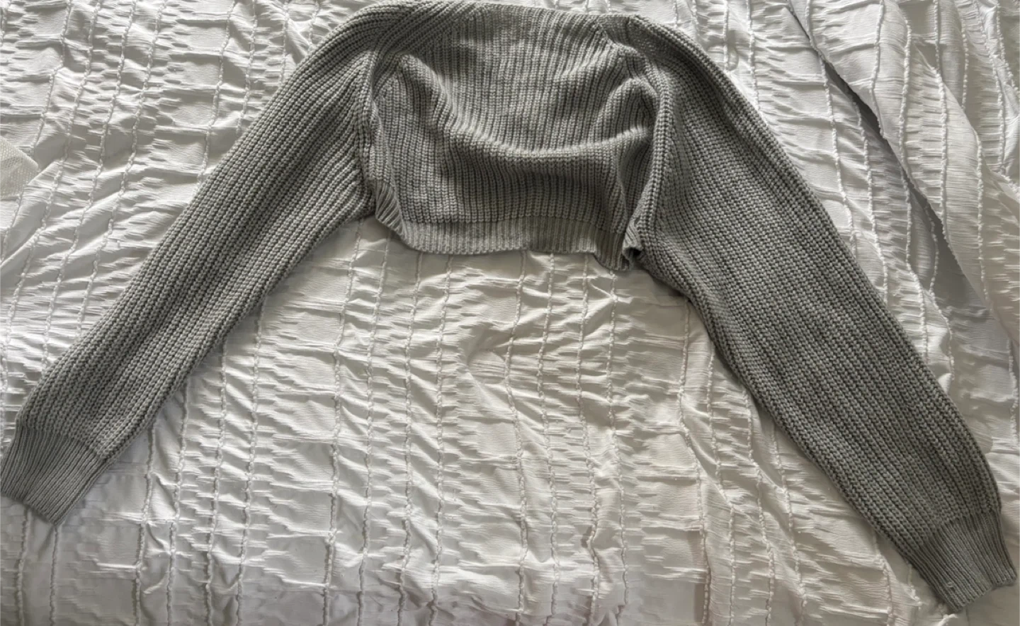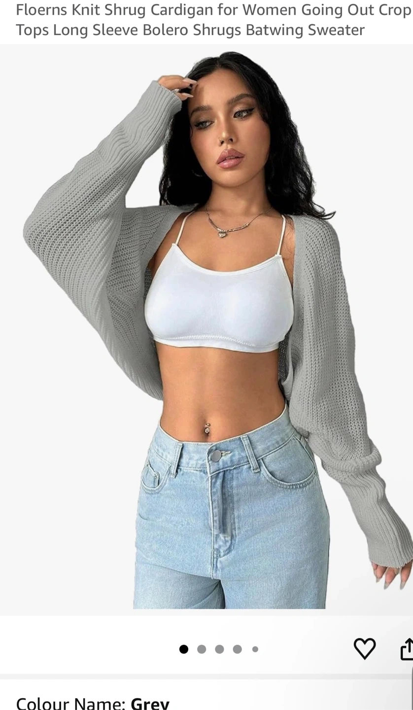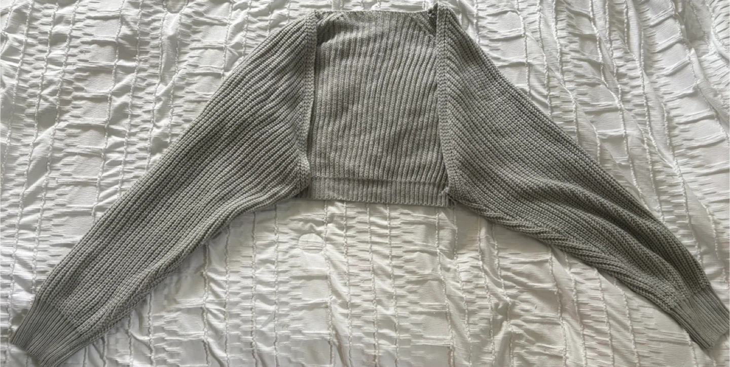 Grey cropped cardigan from Amazon, made from a soft and comfortable knit material. It’s a size medium, in basically new condition, and is perfect to for layering or everyday wear.