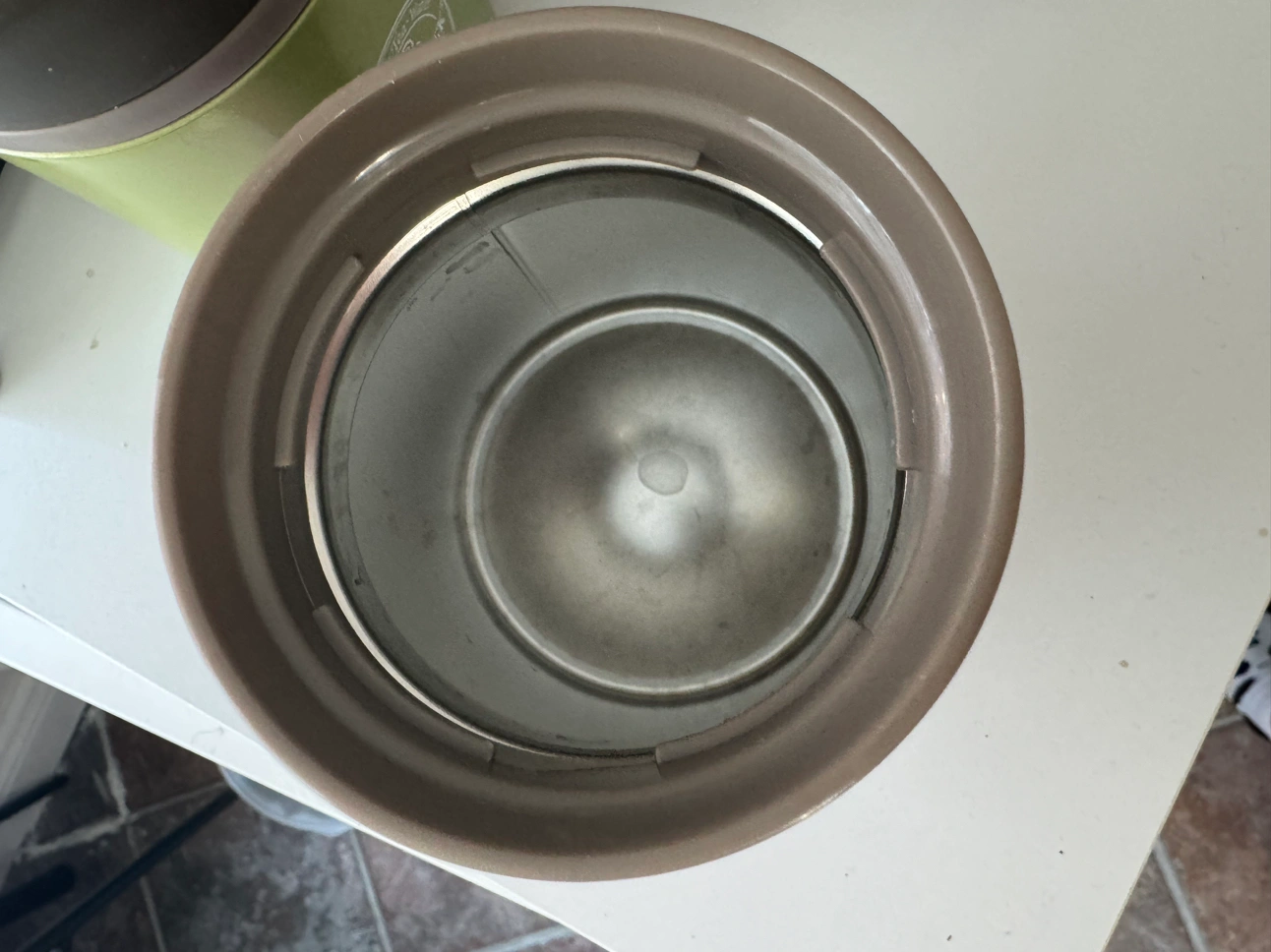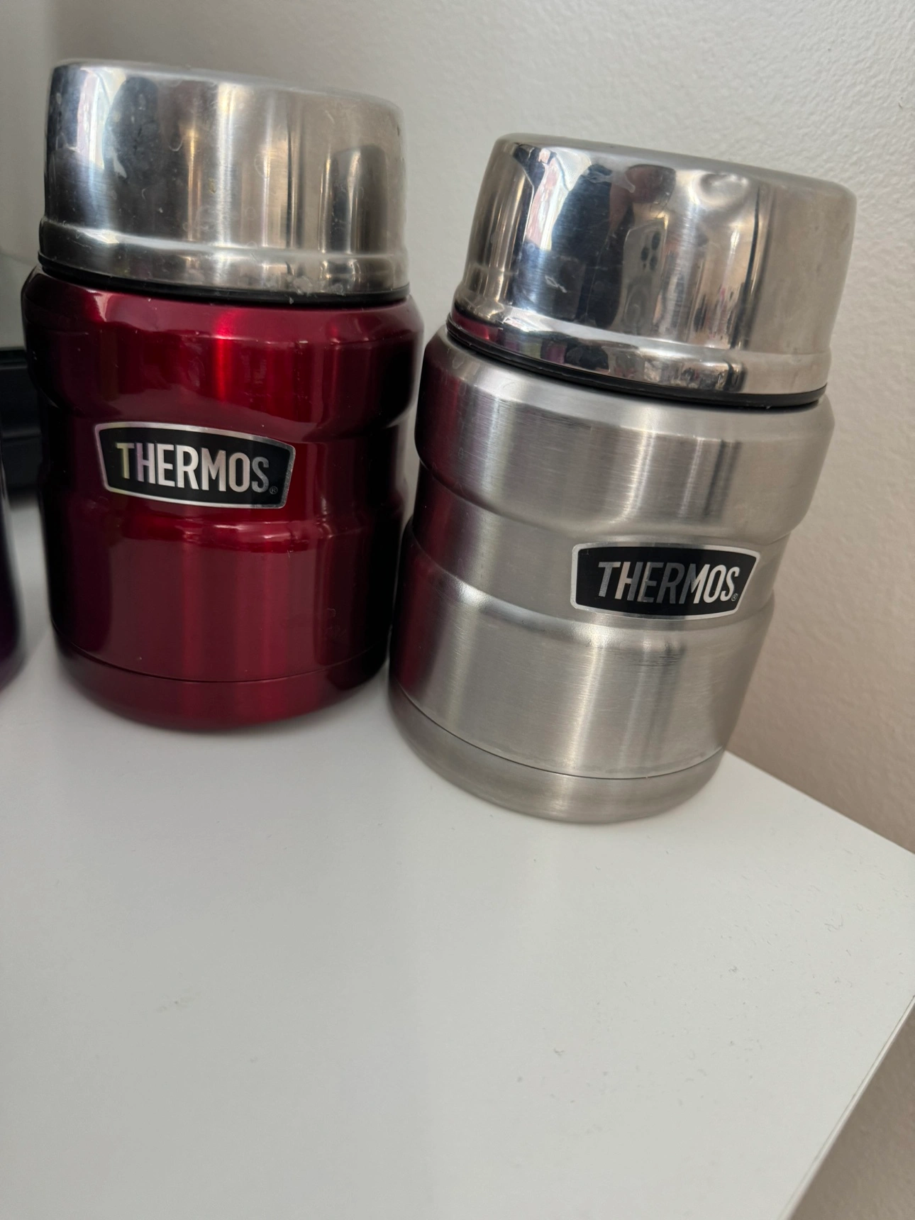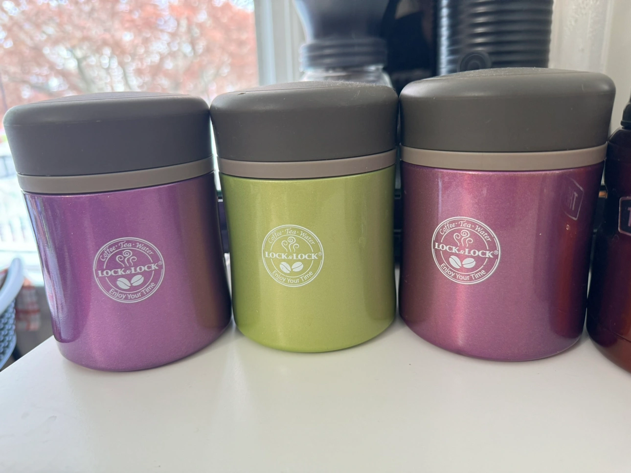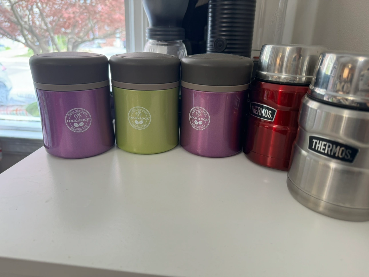 Red and silver Thermos foos jars. Two purple and one green Lock and Lock food jar.