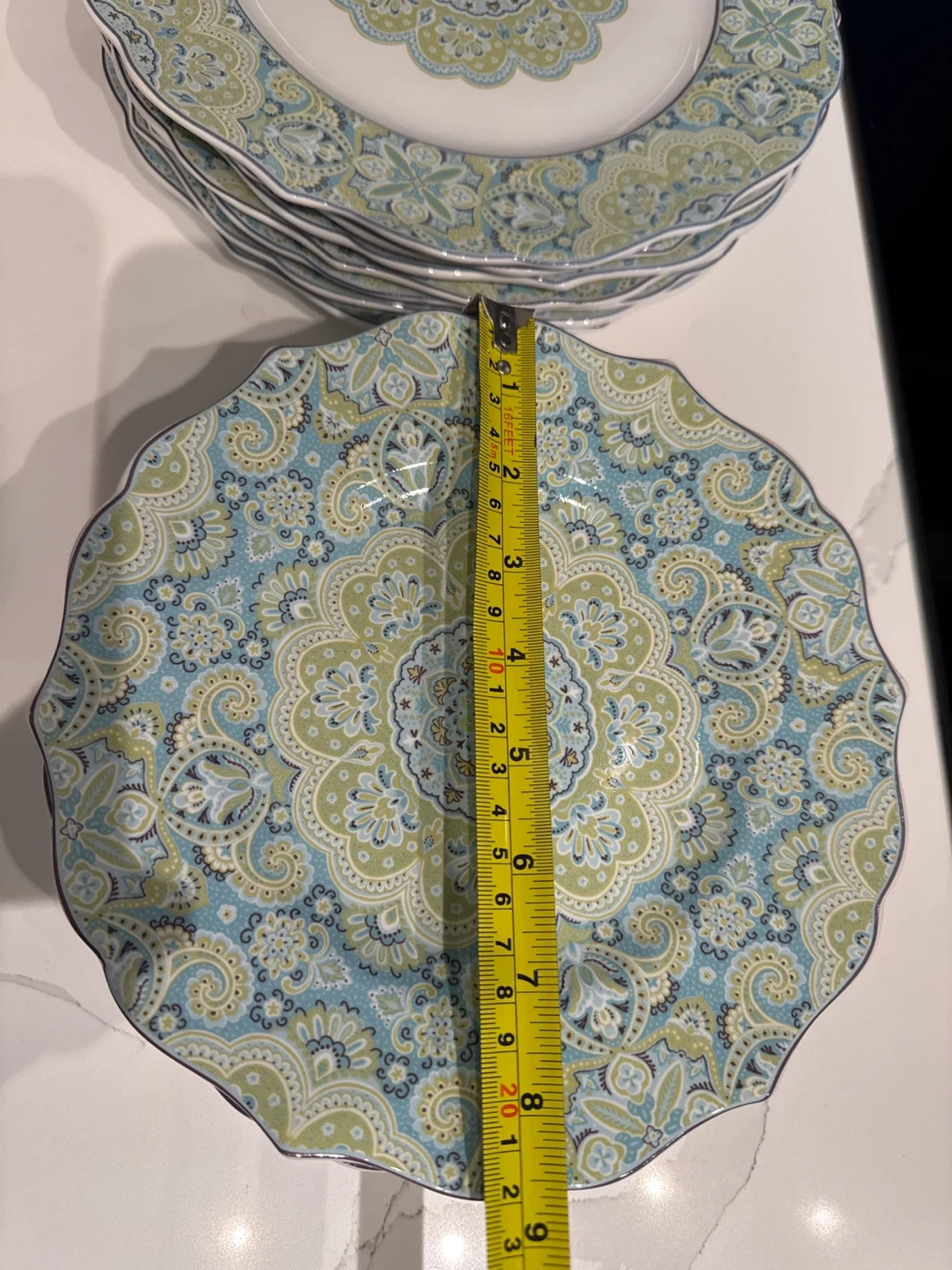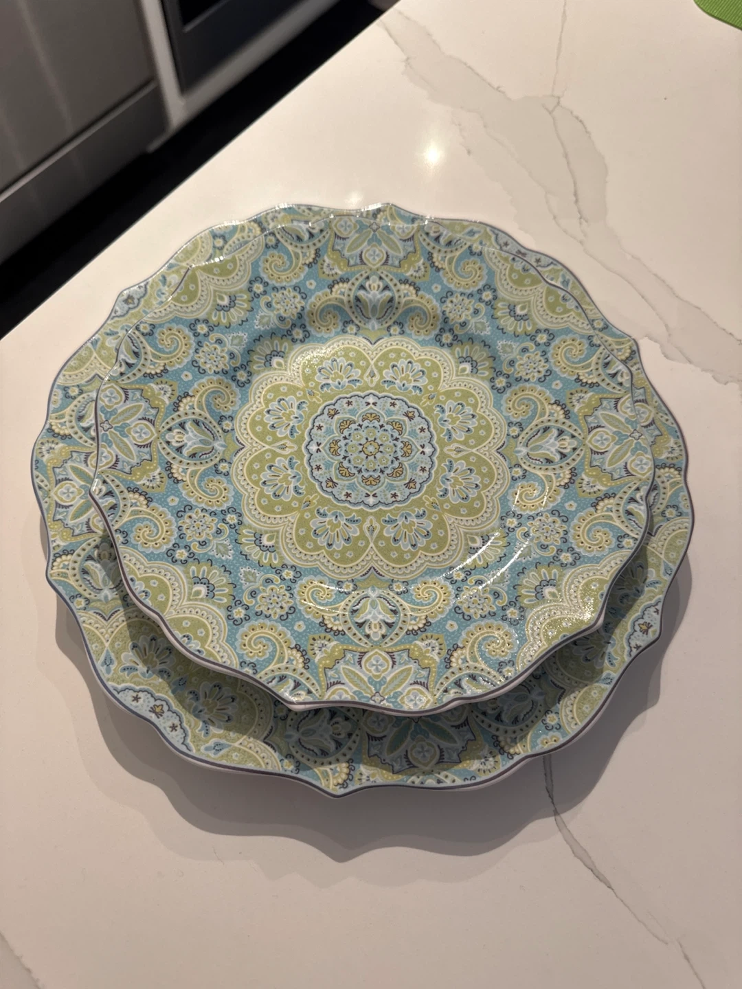 This is a set of 14 decorative plates. They have a vibrant blue, green, and white paisley-inspired pattern. Never used.