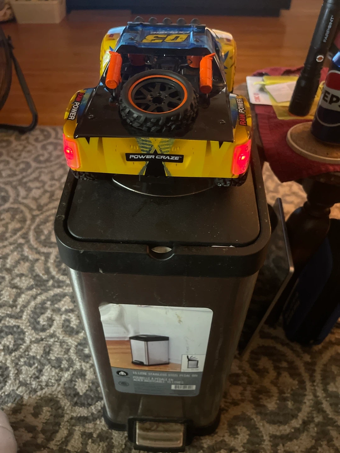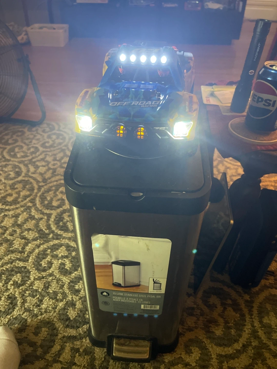 This is a Power Craze RC Offroad Racing Truck. It's blue, yellow, and black with "OFFROAD RACING" graphics. The truck includes a remote control and has working headlights. It's a fun toy for racing adventures! If you’re interested, call or text 519-933-7860. Ask for Bill serious inquiries only strictly cash no e-transfers.