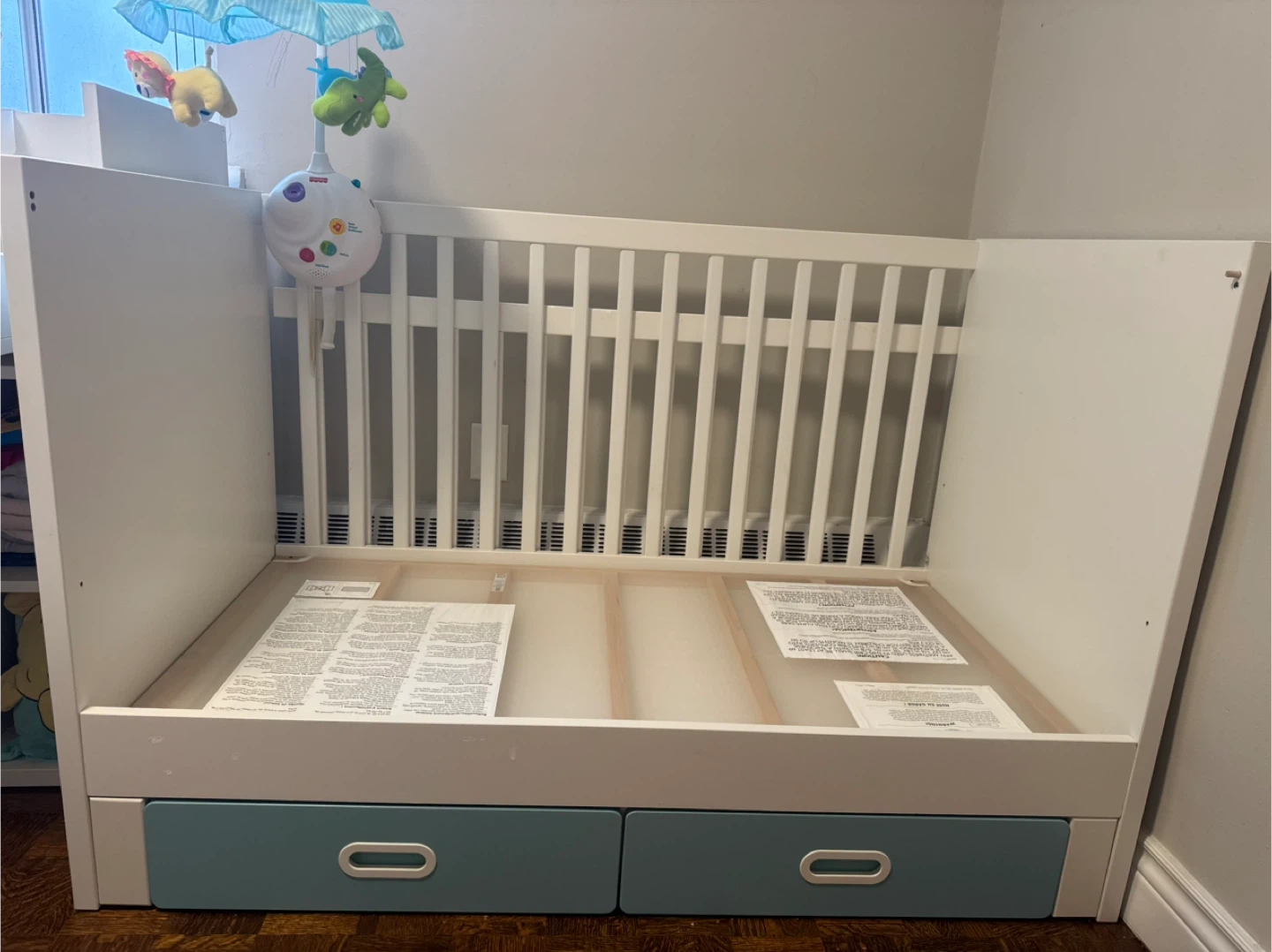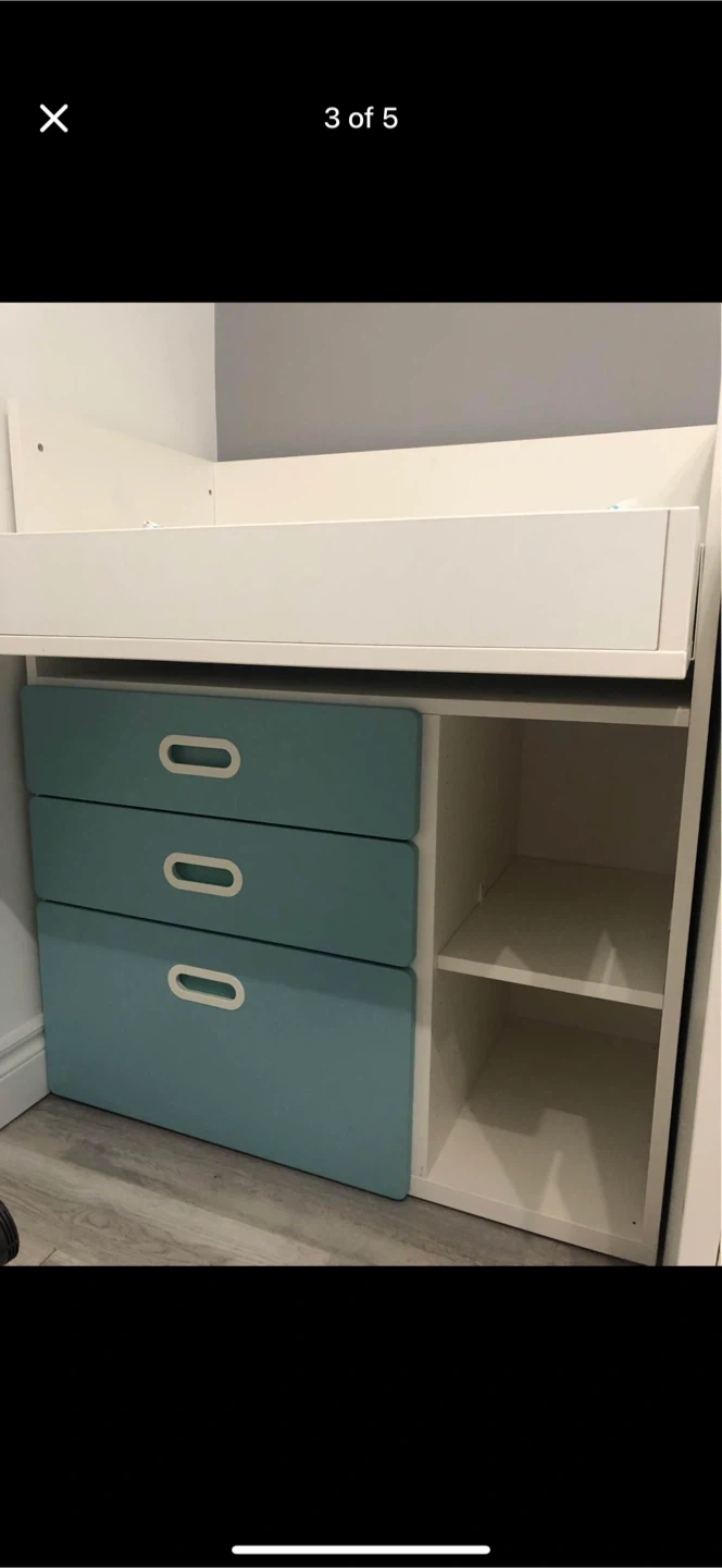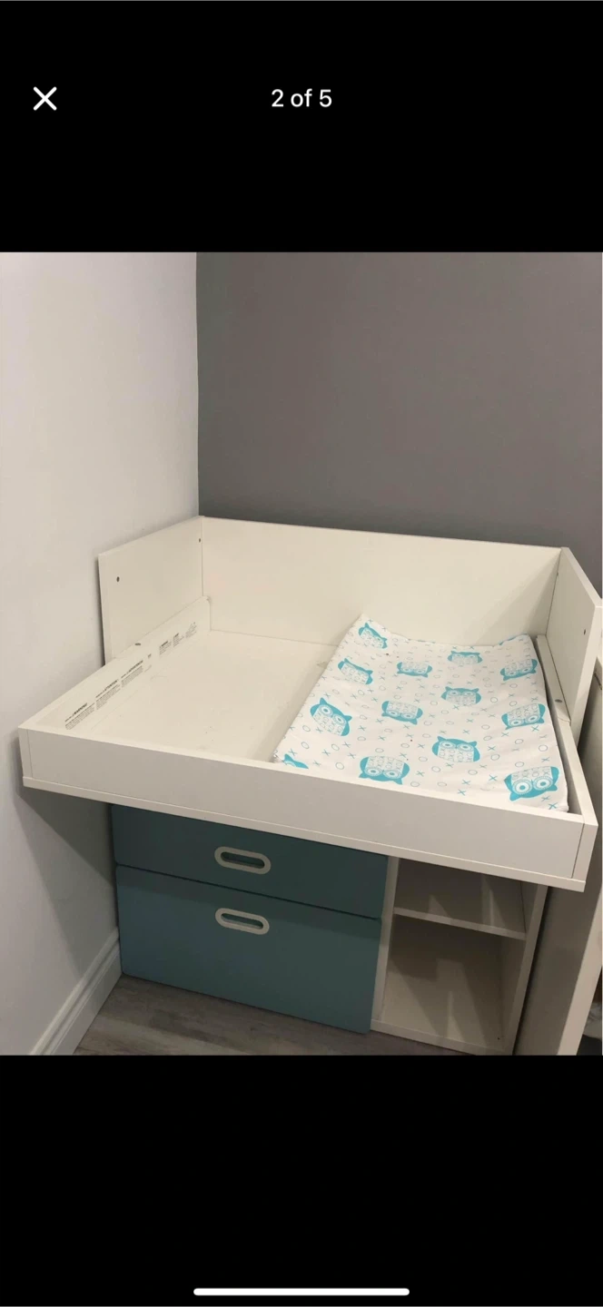 Selling a crib and changing table and wardrobe combo. It's in great condition and perfect for a nursery! The crib has a white frame with a blue drawer section, and the changing table and wardrobe have a white top with matching blue drawers and shelves. Ready for a new home!
