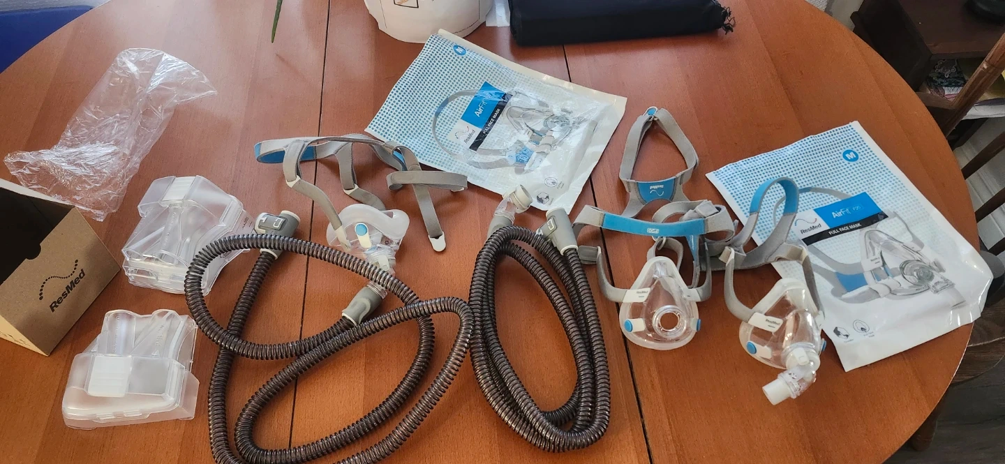This ResMed AirFit P20 CPAP system includes multiple mask sizes and components. It's designed for comfort and effective sleep apnea therapy. Includes hoses, headgear, and multiple mask cushions. $20 for all of it because its used. Airsense10, heated tubes, water chambers