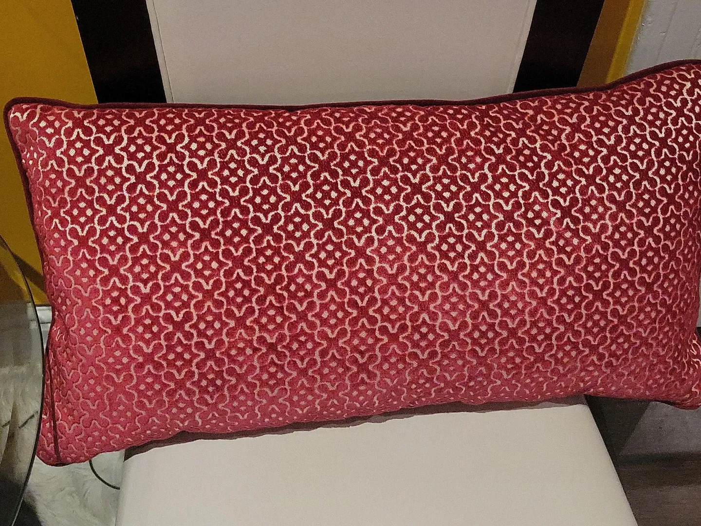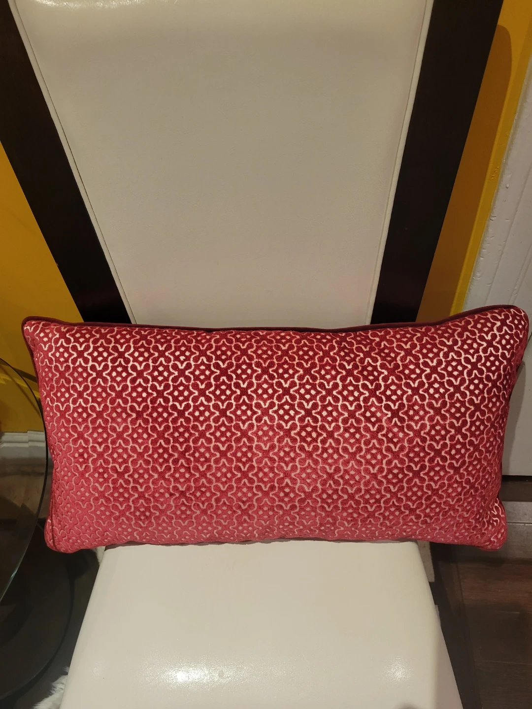 Crimson red lumbar pillow with a subtle geometric pattern. It's made from a plush fabric, likely velvet, offering a soft touch. The decorative piping around the edges adds a nice finish. This pillow's shape makes it suitable for adding comfort and style to chairs or sofas. Only use for staging