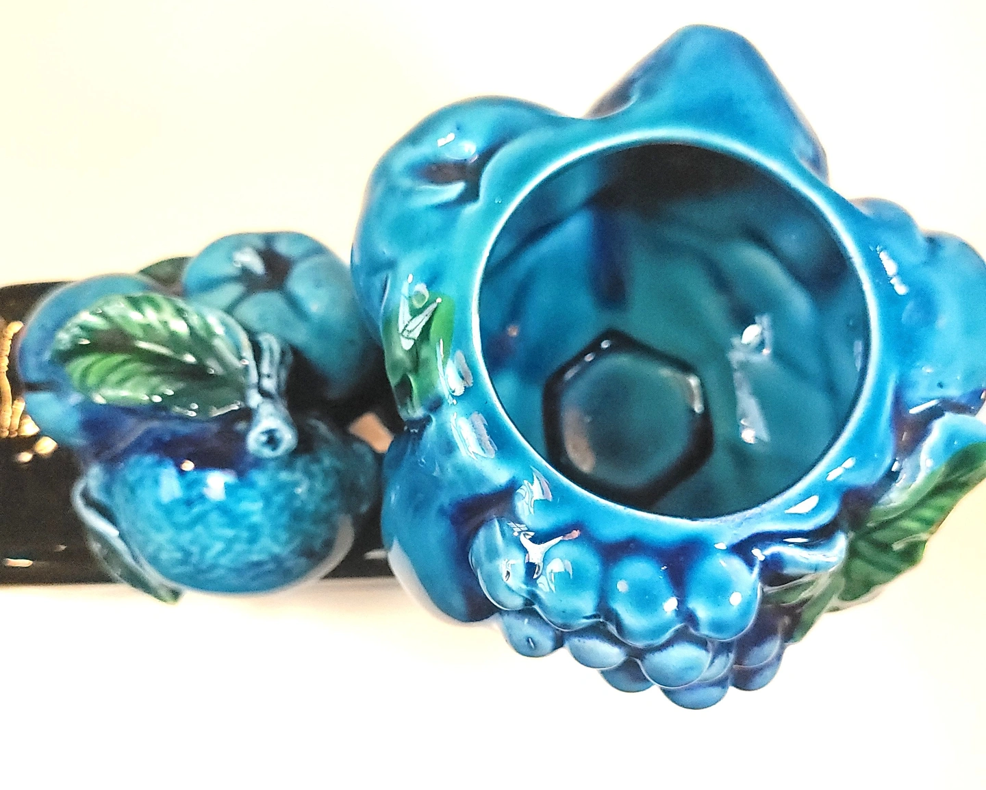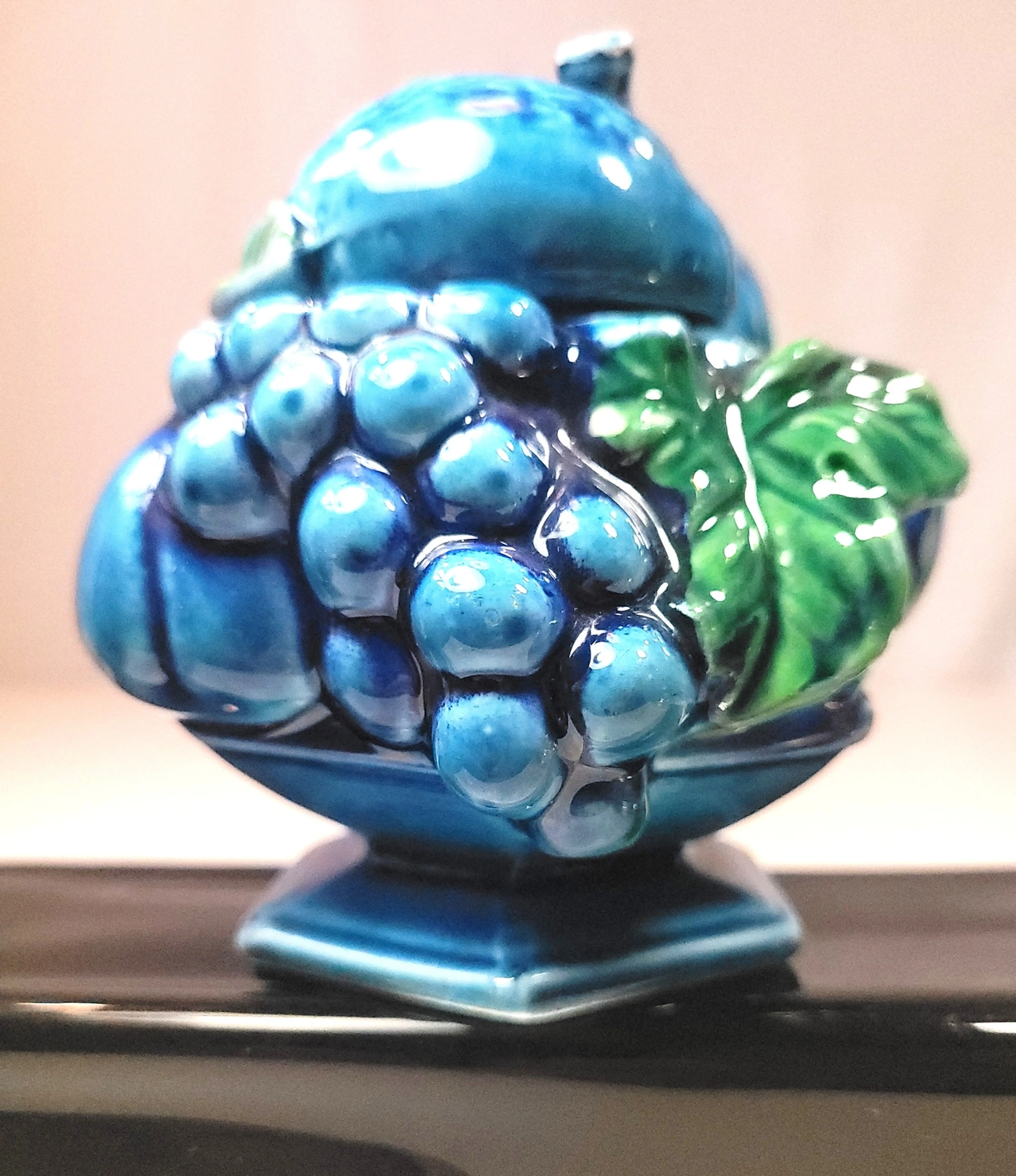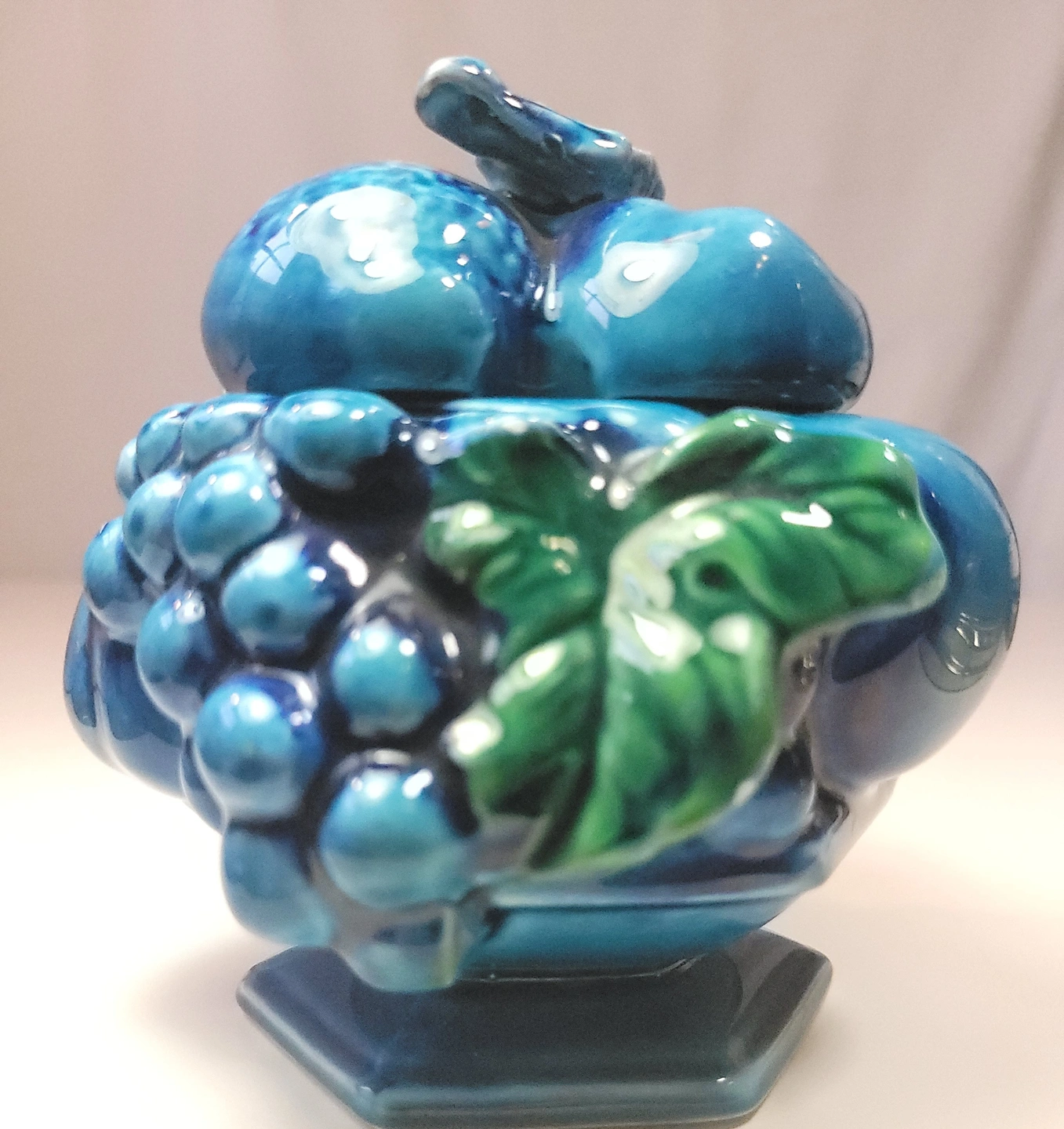 Authentic mid-century modern lidded jar from the highly collectible Inarco "Mood Indigo" line. Produced in Japan in 1968, this piece features the iconic deep blue glaze and 3D embossed fruit and leaf motif. A quintessential piece for collectors of mid-century Japanese pottery and kitchen kitsch.