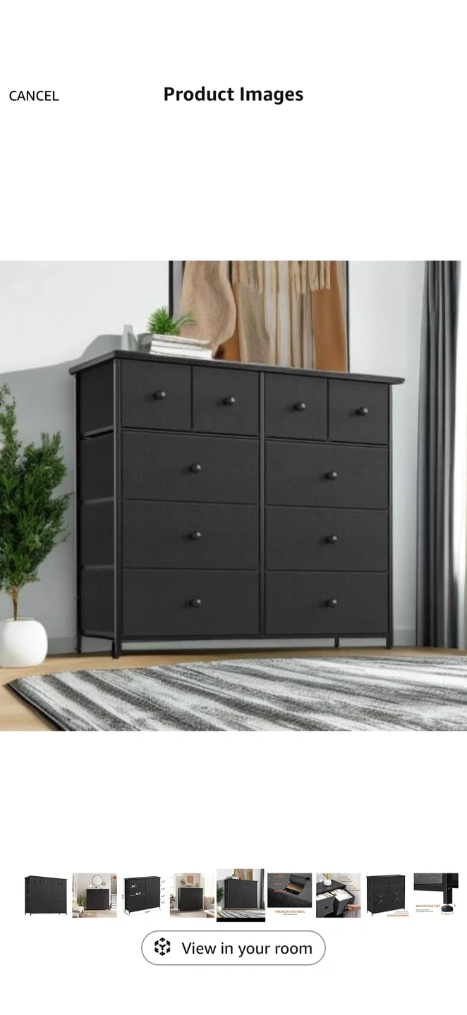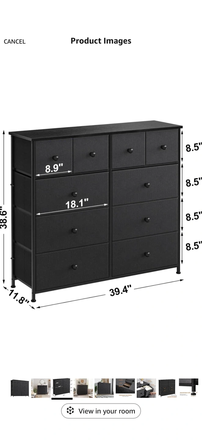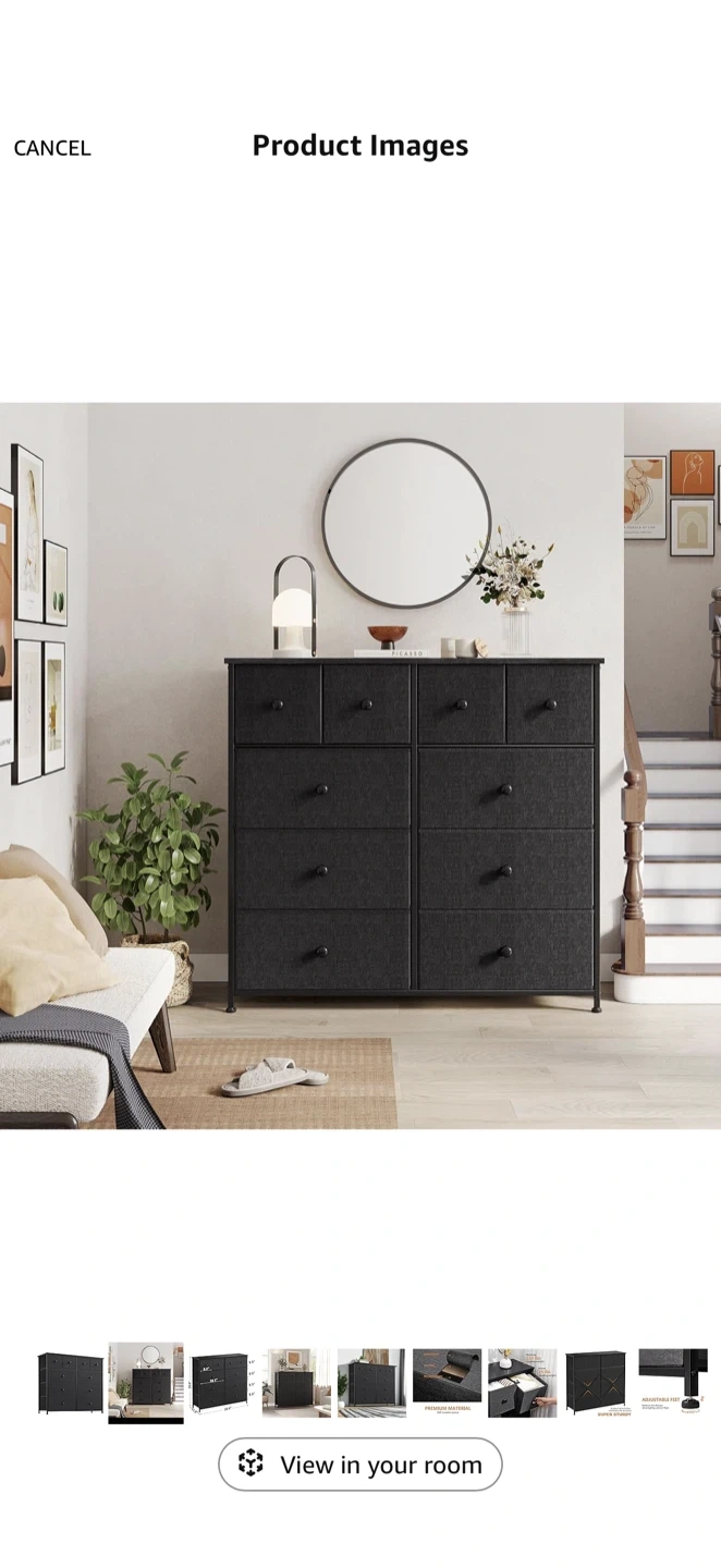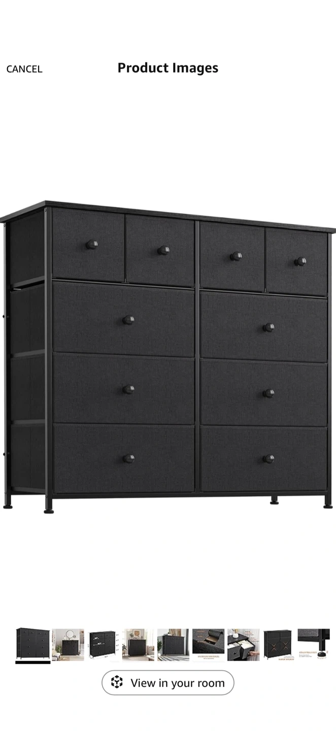 This fabric dresser offers ample storage with 10 drawers. Its metal frame and fabric drawers provide durability. Dimensions are 39.4" W x 11.8" D x 38.6" H. Great for organizing clothes and accessories!
