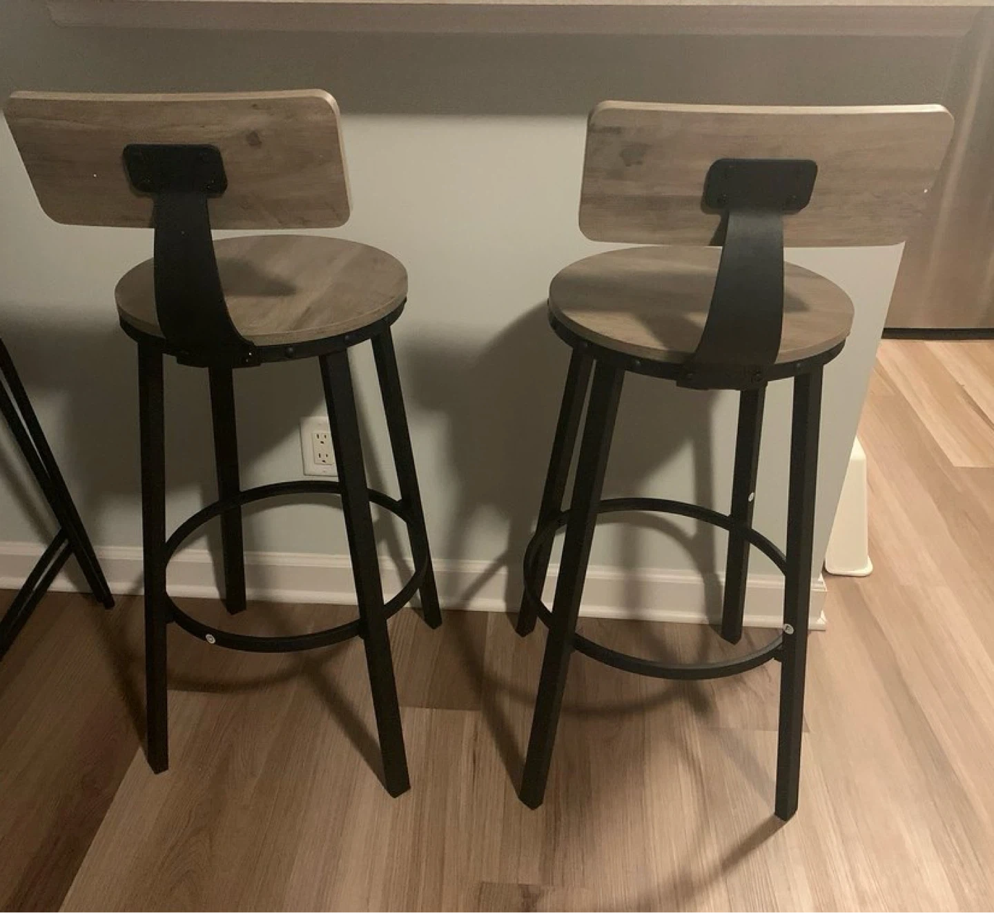 Set of two counter height bar stools. Each stool features a round wooden seat, backrest, and a metal frame with a footrest. Available for pick up in Downtown Jersey City.