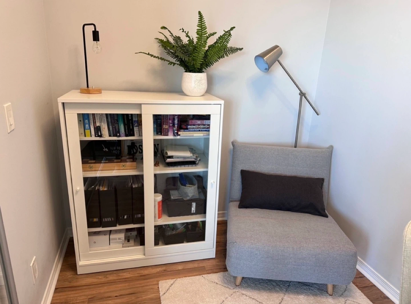 White cabinet, sliding glass doors, 123cmH x 100cmW × 48cmD, adjustable height for shelves, good conditions.