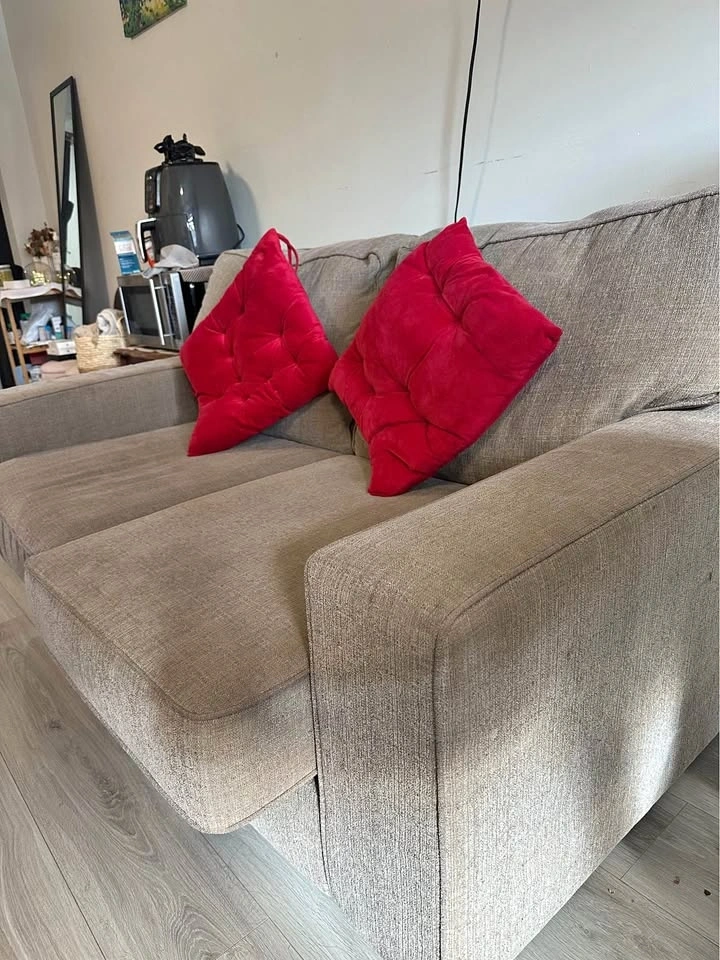 Selling our well-maintained modern beige sofa as we are moving. It’s in great condition and still very comfortable with firm, supportive cushions.