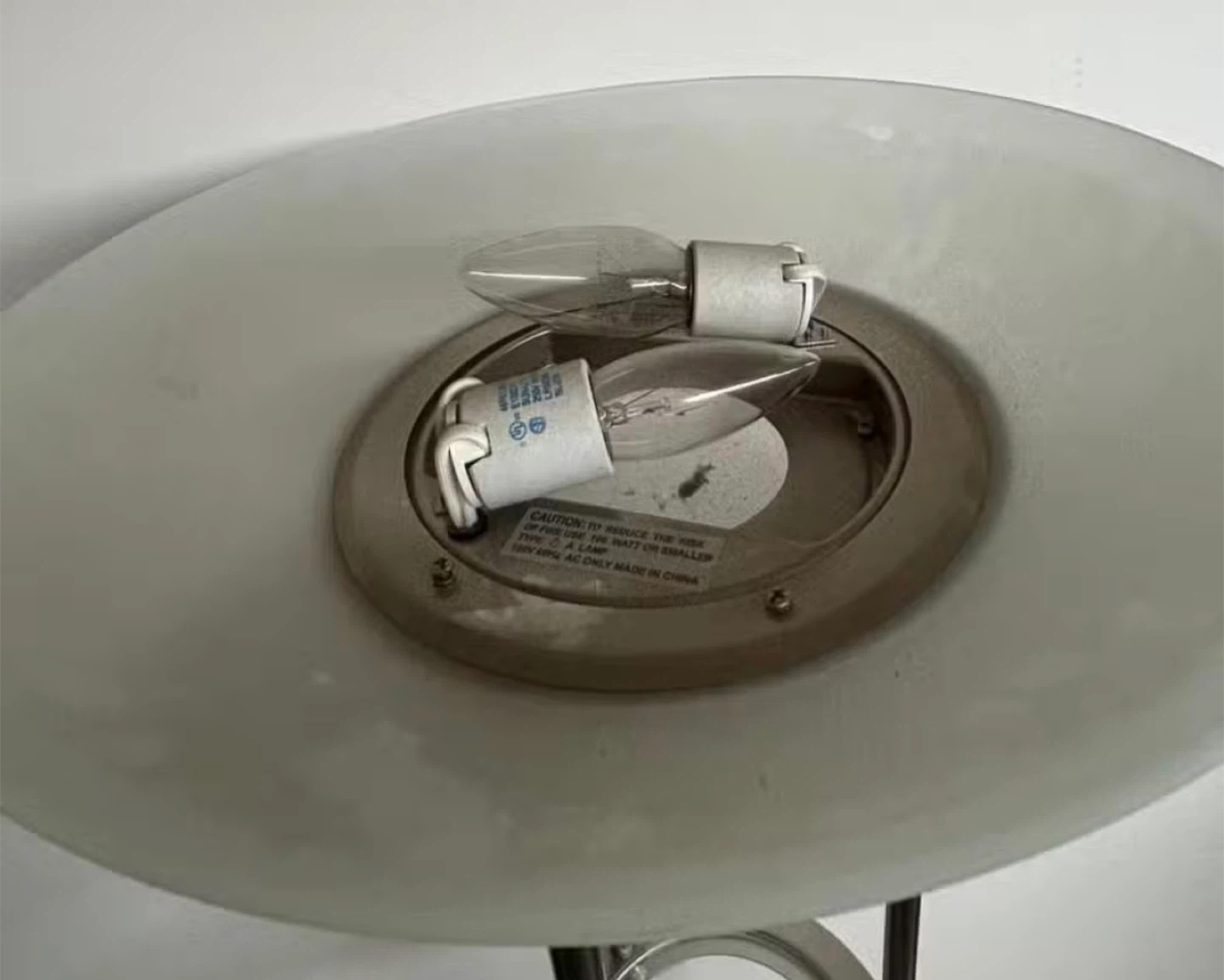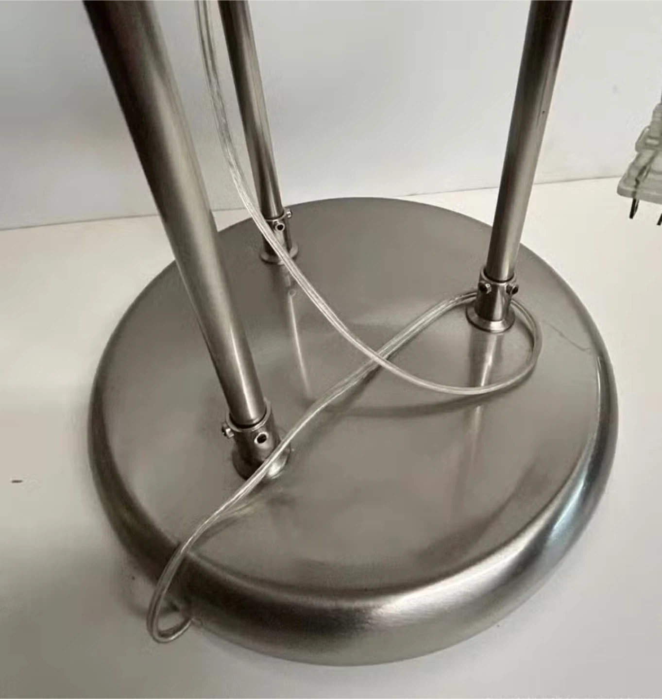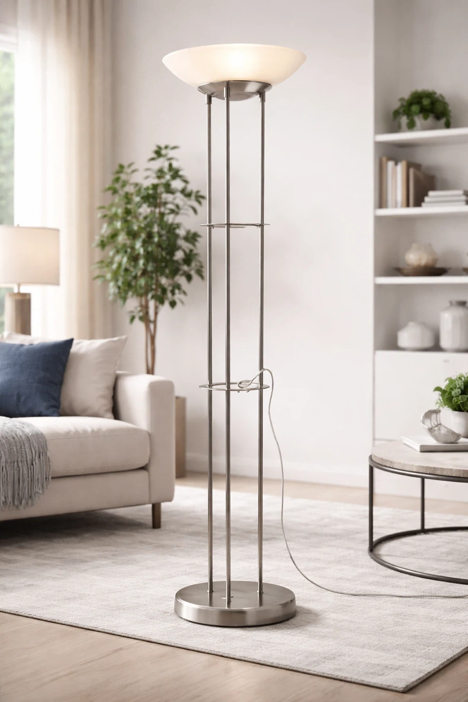 This floor lamp features a sleek brushed nickel finish and a frosted glass shade. It has two clear glass shelves for display or storage. The lamp takes up to 60W bulbs.