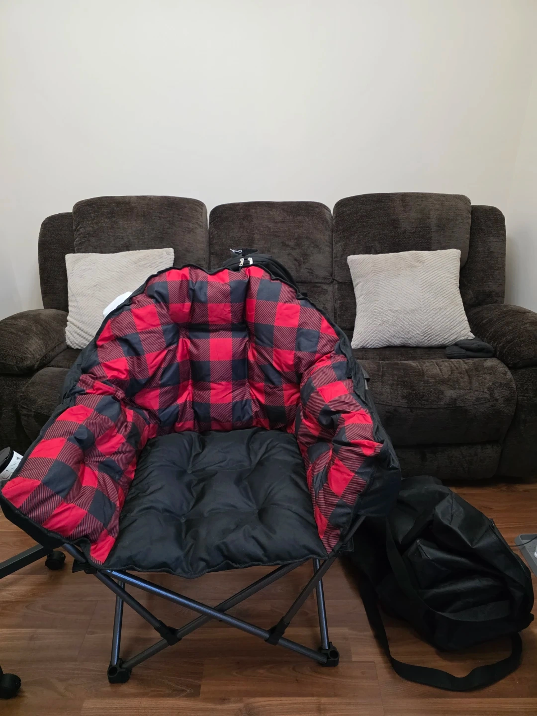 This plush chair features a red and black pattern. It's a portable folding chair, perfect for outdoor events or lounging. Comes with a carrying bag for easy transport.