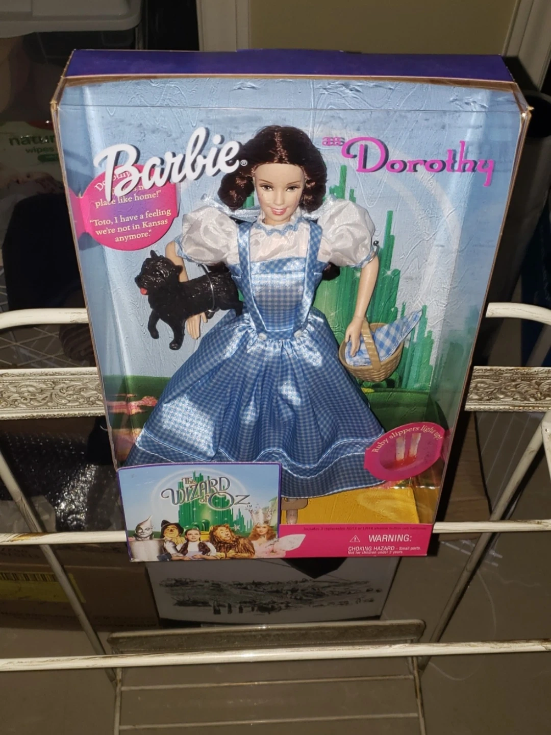 This is a Barbie doll as Dorothy from The Wizard of Oz. It includes Toto and a basket. Ruby slippers light up! Sealed.