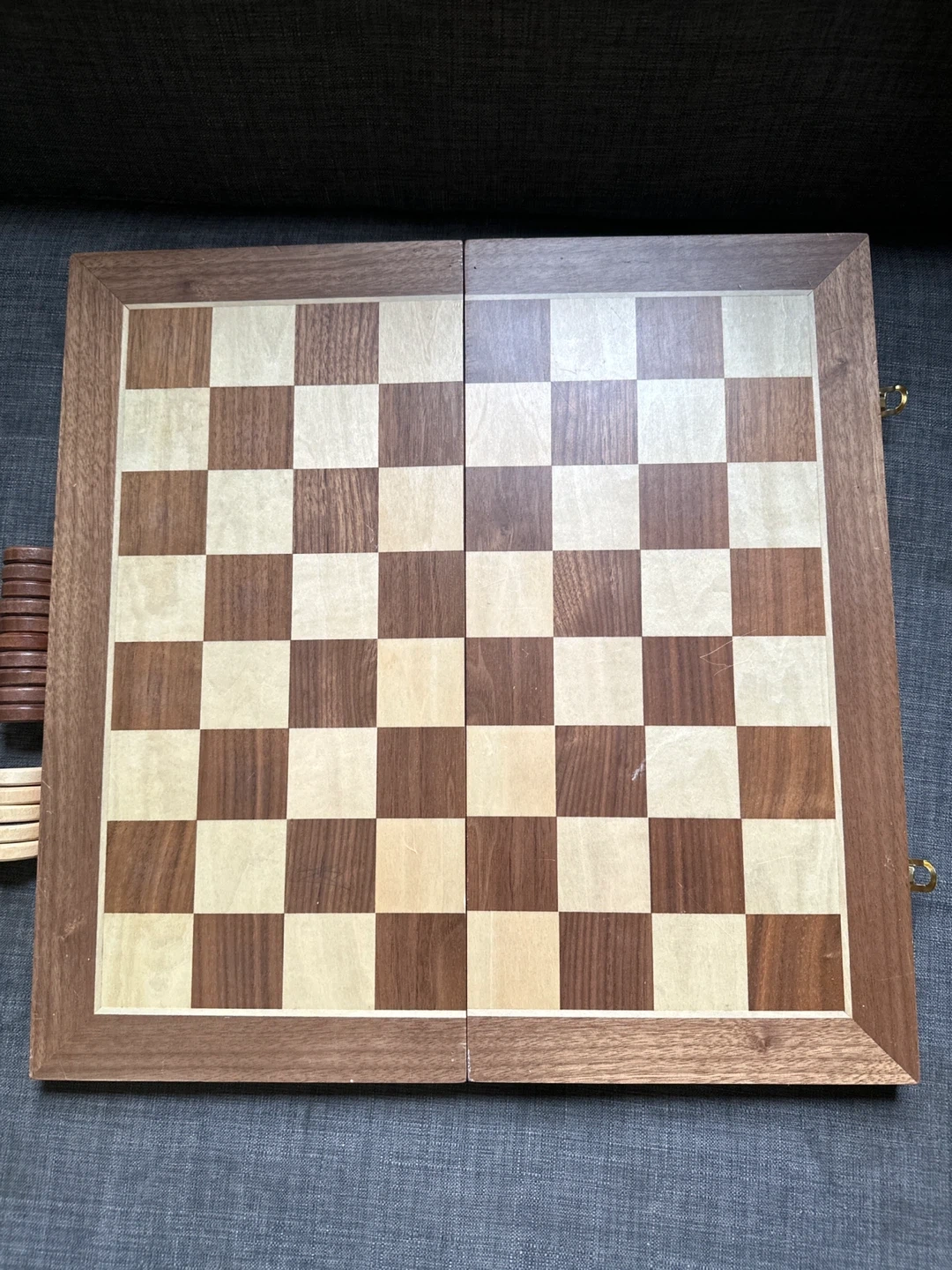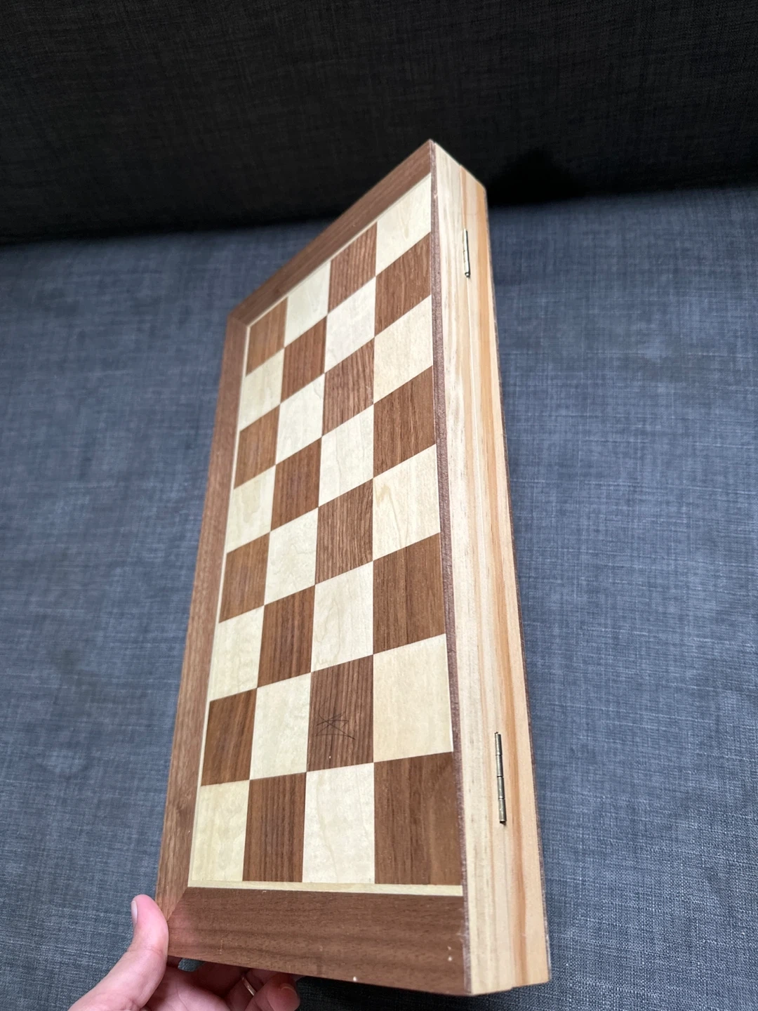 This wooden chess set includes a folding chessboard and all 32 pieces. The board has a wood grain pattern and hinges for easy storage. Pieces are made of wood and have a classic design. This set is great for casual play or travel!