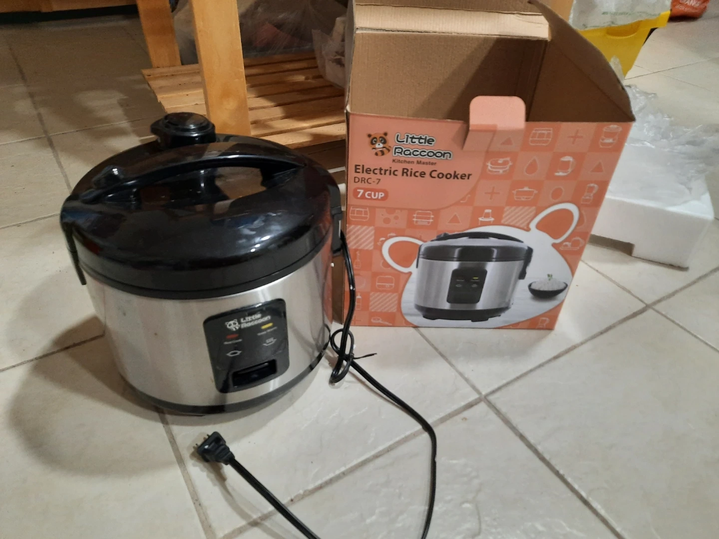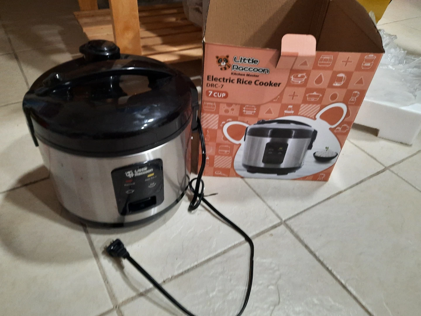 This Little Racoon electric rice cooker is a 7 cup model. It's ideal for small to medium-sized households. The cooker comes with its original box.